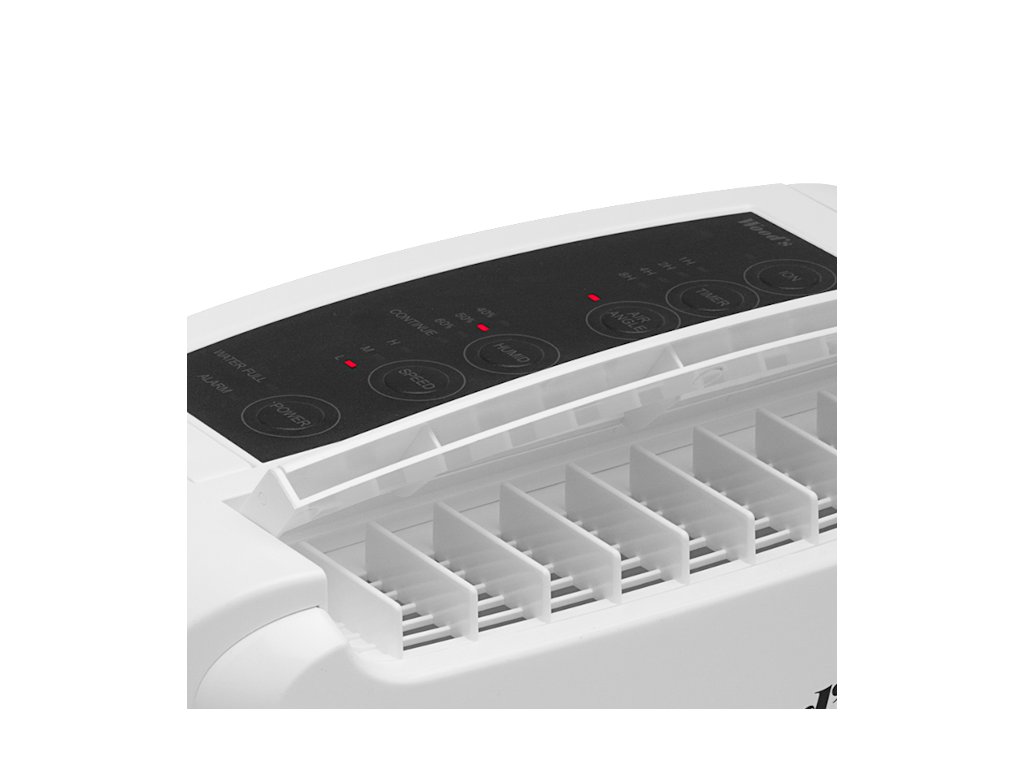 Na ovládacom paneli v hornej časti zariadenia si jednoducho dokážete zvoliť 1 z 3 rýchlosti ventilátora. Pri nízkej a strednej rýchlosti ventilátora si môžete nastaviť hodnotu vlhkosti 40%, 50% alebo 60%. Môžete si tiež aktivovať časovač, alebo nastaviť sklon lamely na výstupe vzduchu.