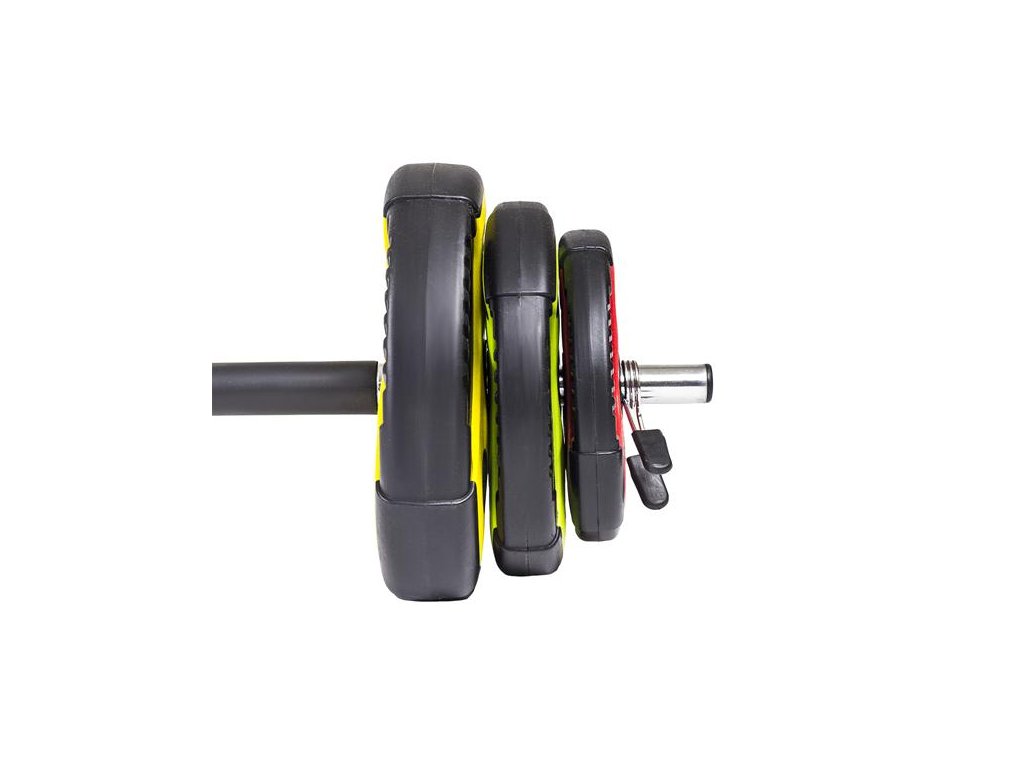 Set sa skladá z osi, 3 párov kotúčov a 2 pružinových uzáverov. Os je vyrobená z kvalitnej pochrómovanej ocele, zaručuje výnimočnú trvanlivosť produktu. Je pokrytá penou, vďaka ktorej sa dobre drží v dlani, nekĺže sa počas cvičenia a tiež zamedzuje odreninám a otlakom. Kotúče sú vyplnené cementom a pokryté gumou, ktorá zamedzuje poškodeniu a poškrabaniu podlahy. Vďaka držadlám môžu byť použité aj ako činky. Pokryté sú farebnou gumou, kde každá farba označuje inú hmotnosť. Dodávané uzávery sú dostatočne silné aby udržali kotúč na svojom mieste aj počas dynamického cvičenia.