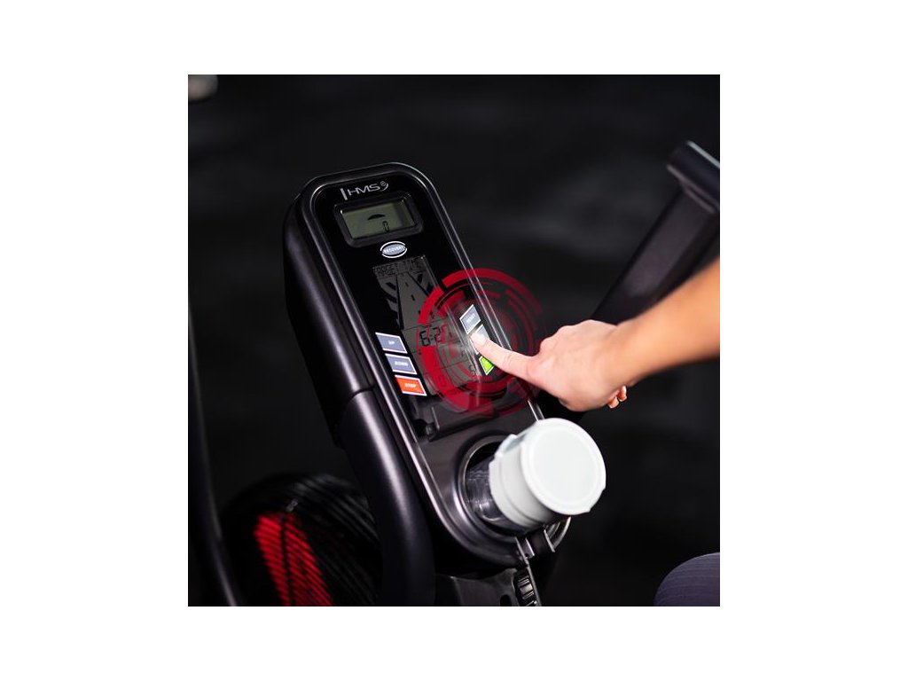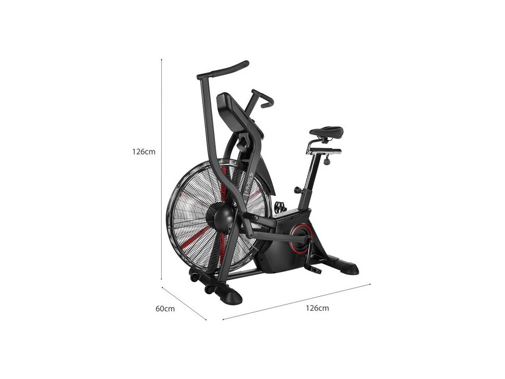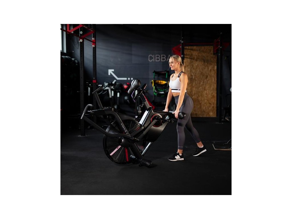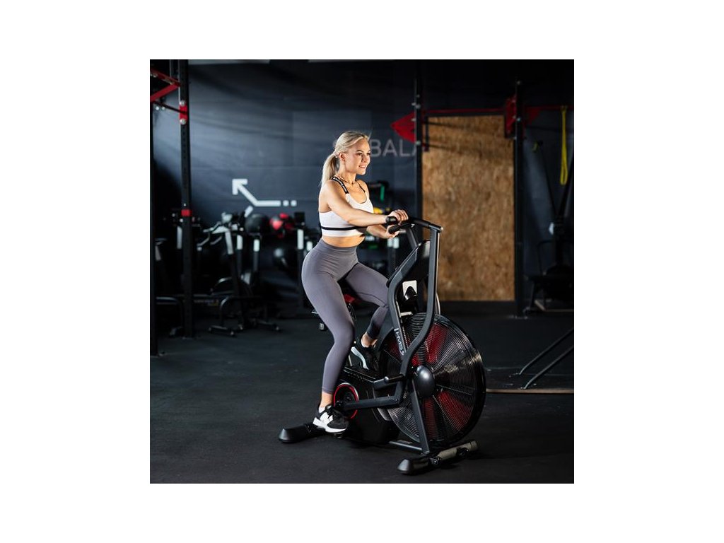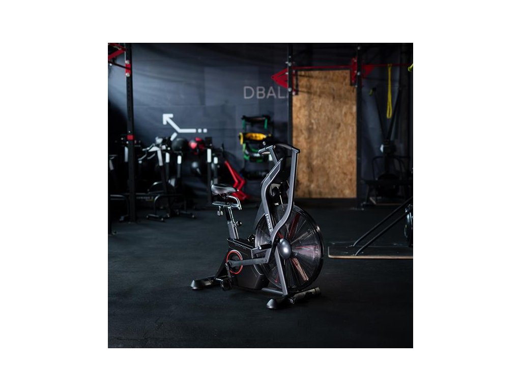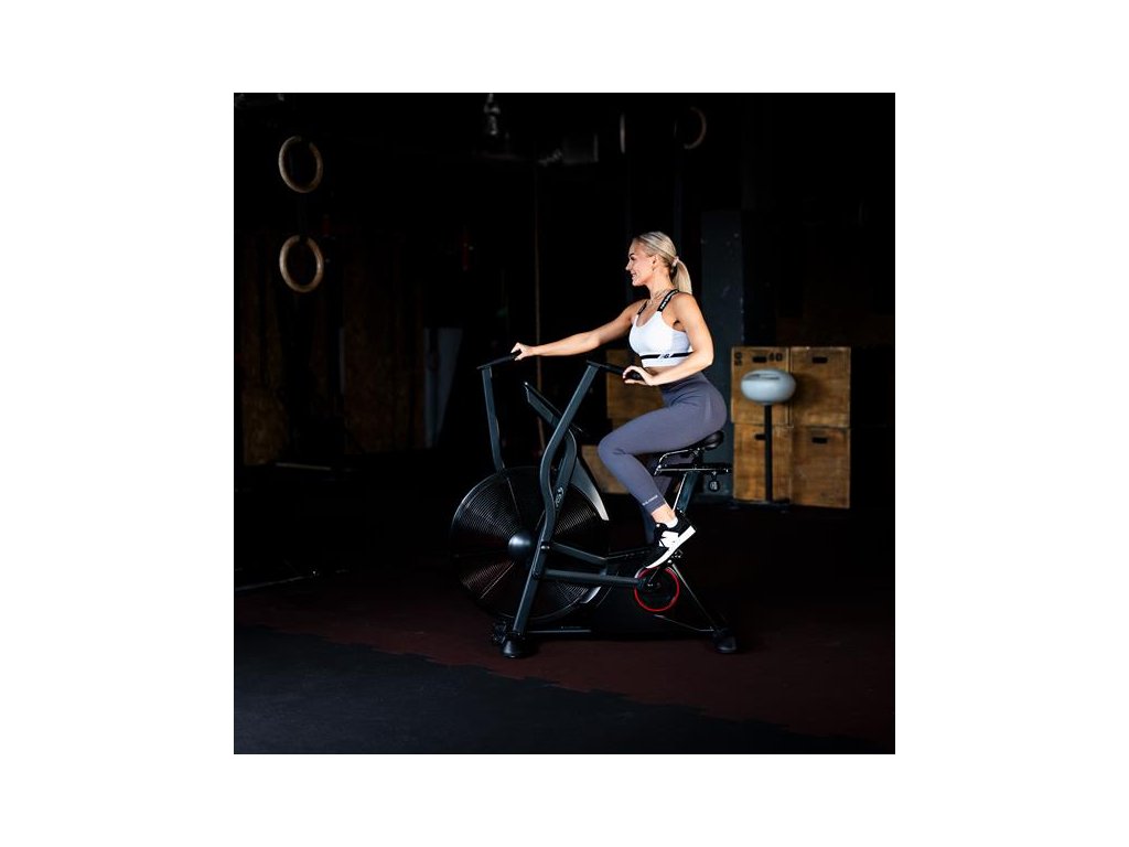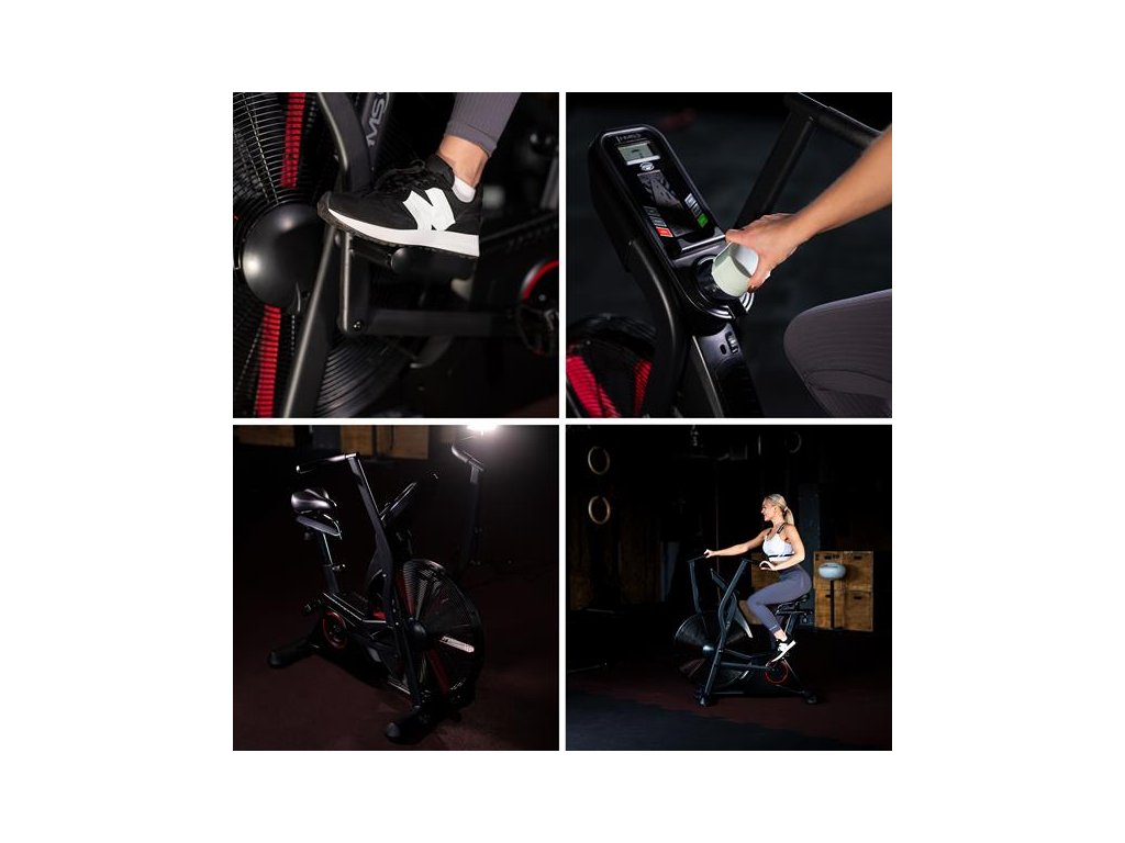 Air bike je vybavený LCD displejom, ktorý umožňuje sledovať kľúčové parametre tréningu: čas, vzdialenosť, rýchlosť, pulz, spálené kalórie a otáčky za minútu. Nastaviteľné sedlo vo vertikálnom a horizontálnom smere umožňuje precízne prispôsobenie pozície podľa výšky a postavy, čo zaisťuje komfort aj pri dlhodobom používaní. Praktické doplnky, ako držiak na fľašu, telefón a transportné kolieska, zvyšujú pohodlie pri používaní zariadenia.