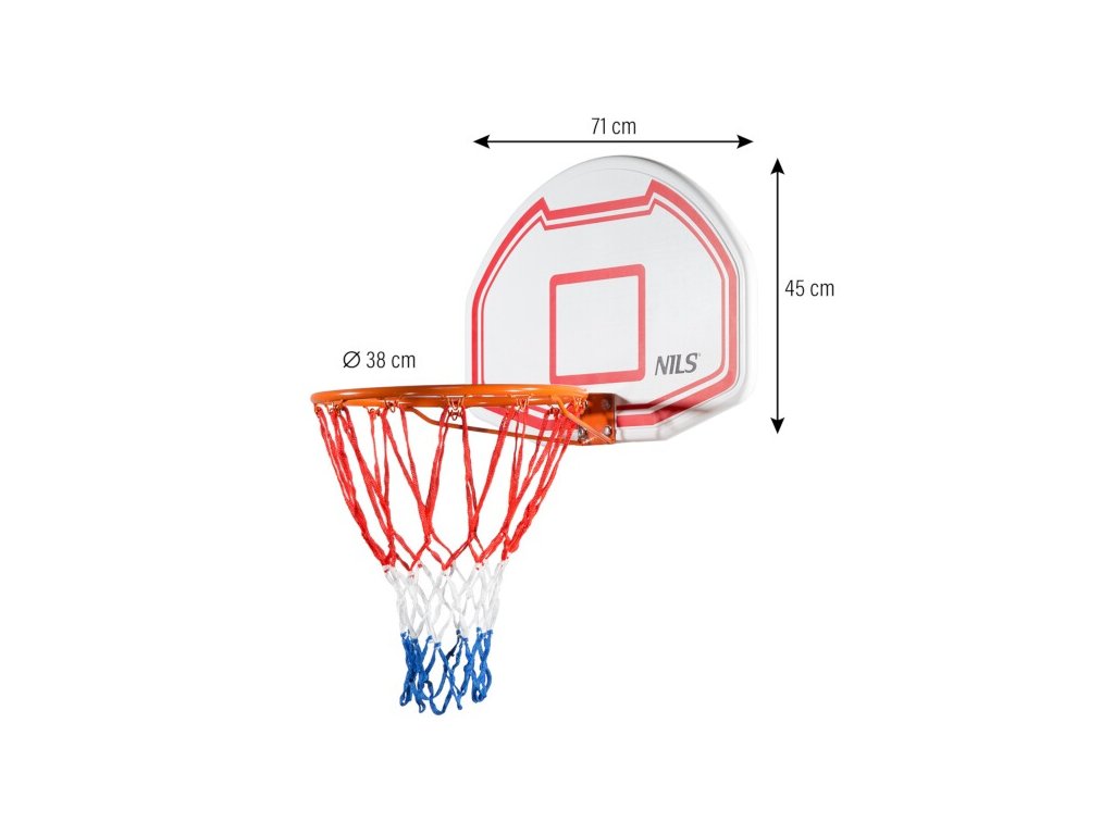 Doska s rozmermi 71 x 45 cm je vyrobená z odolného PVC, oceľová obruč má priemer 38 cm. Použité materiály a ich povrchová úprava sú odolné voči poveternostným vplyvom, takže kôš môžete používať v interiéri aj exteriéri.