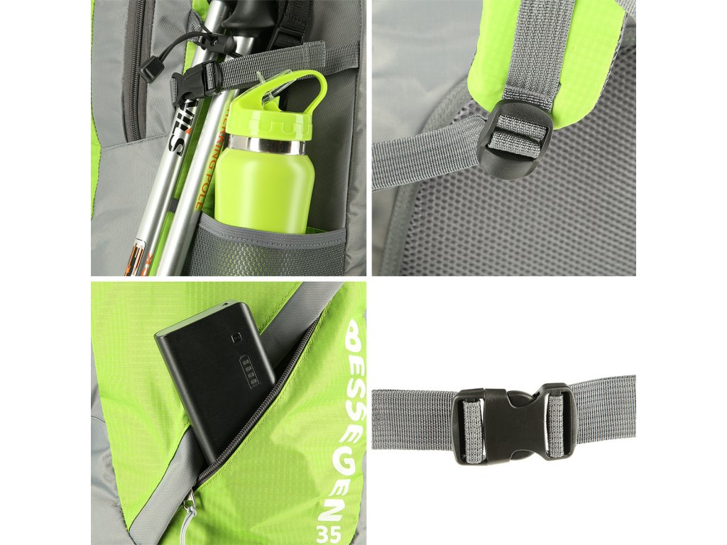 Model Bessegen má celkom 3 priehradky s celkovým objemom 35 litrov. Veľká hlavná komora sa otvára pomocou dvojcestného zipsu, priestor je dostatočne veľký na uloženie všetkých vecí potrebných napríklad na celodenný výlet s deťmi. Do strednej komory sa zmestia dokumenty a zložky až do veľkosti A4. Predná priehradka je určená na menšie predmety, ako je peňaženka alebo mobilný telefón. Po stranách batohu sú 2 priehradky zo sieťoviny, do ktorých sa zmestí napríklad fľaša na vodu, dlhšie predmety sa dajú dodatočne upevniť pomocou popruhov s prackou. Pútka na bokoch slúžia na pripevnenie turistických palíc. Posledné 2 vrecká na zips sa nachádzajú na bedrovým popruhu a môžete ich použiť napríklad na mince alebo kľúče od domu.