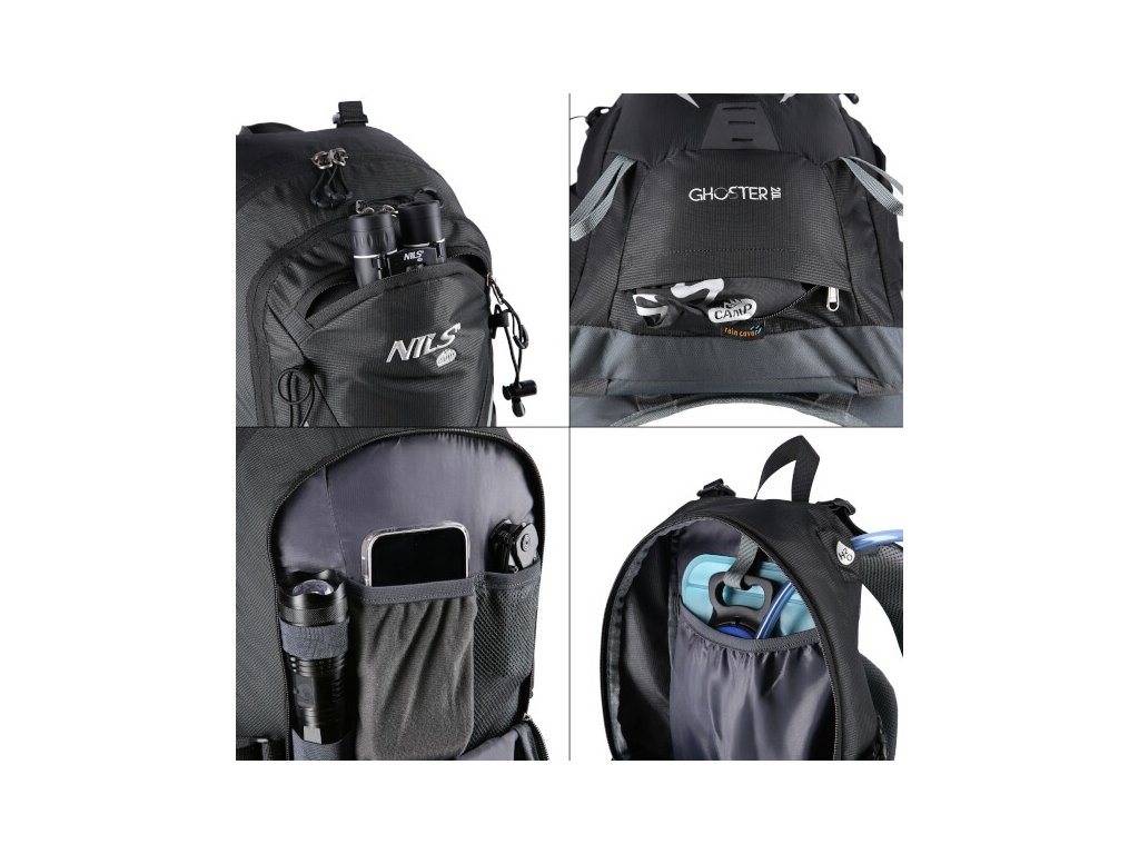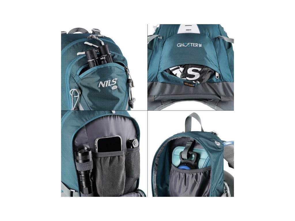 V hlavnom priestore s dvojcestným zipsom sa nachádza kapsa na hydratačný vak, ktorý možno zavesiť na popruh so suchým zipsom. Druhá, menšia komora je tiež vybavená dvojcestným zipsom a vo vnútri sa nachádzajú 2 vrecká na drobnosti a 3 pútka na umiestnenie napríklad baterky. V hornej časti predného panelu sa nachádza menšie vrecko, ktoré je prístupné pomocou jednosmerného zipsu. Na bokoch batohu sú sieťované vrecká s gumou v leme, nad vreckami sú dĺžkovo nastaviteľné popruhy s prackou, pod ktoré môžete umiestniť napríklad vyššiu fľašu. Na prednej strane batohu sú 2 gumené pútka a 2 pútka na nosenie turistických palíc, 4 pútka na zavesenie napríklad kempingového vybavenia a pútko na pripevnenie svetielka na zvýšenie viditeľnosti za súmraku.