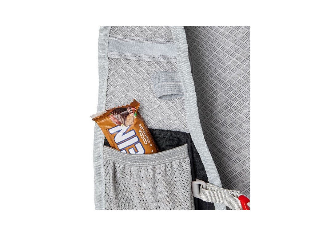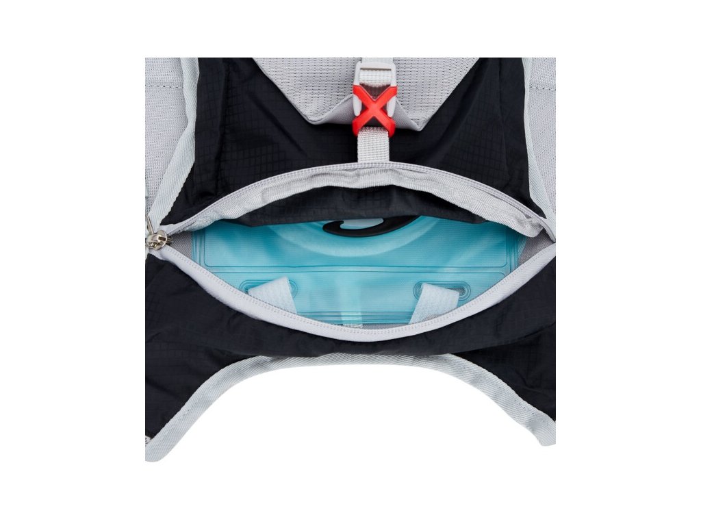 Hlavná komora batohu je vybavená prepážkou, v hornej časti je pútko s karabínkou, na ktorom visí odnímateľné vrecko, do ktorého možno batoh zložiť a mať ho ako zálohu v hlavnej batožine. Vedľa pútka nájdeme 2 popruhy na suchý zips na zavesenie vodného vaku (nie je súčasťou balenia). Hadicu vodného vaku možno viesť cez priechodky na pravej a ľavej strane pod ramennými panelmi. Predné sieťované vrecko sa uzatvára pomocou pracky. Sieťovina je podšitá nylonom, takže vrecko nie je elastické. Pod vreckom sa nachádza reflexný panel, na ktorý môžeme pomocou popruhu pripevniť vybavenie (napríklad prilbu). Na hornej strane batohu je popruh na jednoduché nosenie Trippera v ruke. Chrbtové a ramenné popruhy sú vyrobené zo sieťoviny doplnenej priedušnou penou, ktorá zvyšuje priedušnosť panelu a váš chrbát sa bude menej potiť. Ramenné popruhy sú vybavené reflexnými pásikmi, gumovou slučkou na hadicu hydrovaku a elastickými vreckami. Okrem toho je na ľavom popruhu vrecko s priehľadnou prednou stranou, do ktorého možno uložiť napríklad kartu v prípade straty, štartovacie číslo atď. Popruhy sú spojené popruhom s plastovou prackou.