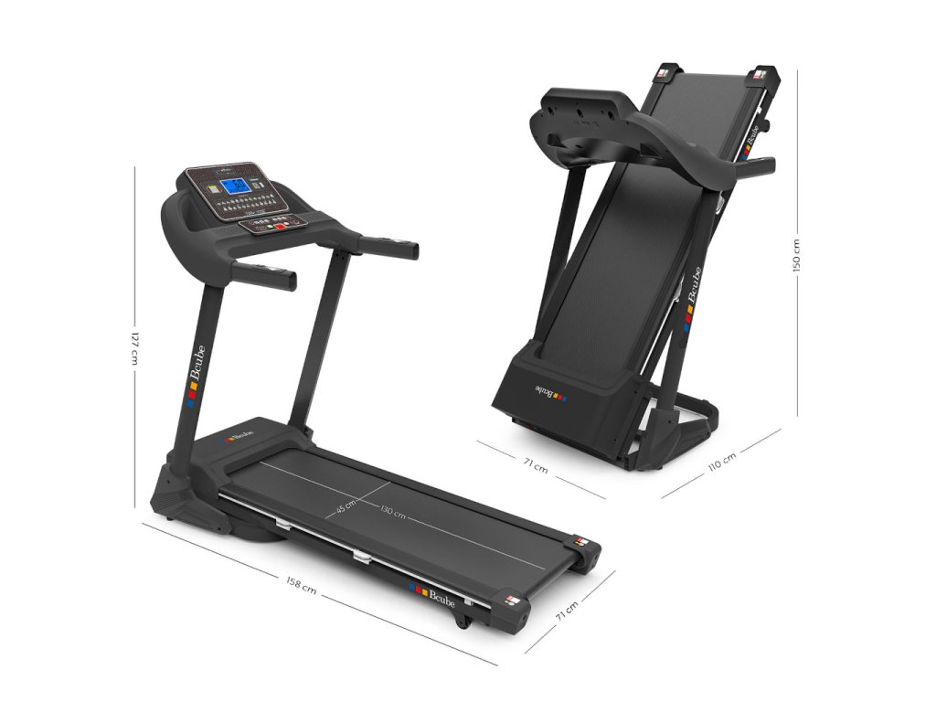 Výkonný 2 HP motor umožňuje dosiahnuť rýchlosť až 18 km/h, takže je vhodný na rýchlu chôdzu, jogging aj intenzívny beh. Elektrický sklon do 12 % simuluje beh do kopca a zvyšuje náročnosť tréningu. Bežecká plocha s rozmermi 45 × 130 cm poskytuje dostatok priestoru a vďaka dvojitému elastomérovému odpruženiu chráni kĺby. Pás s hrúbkou 1,6 mm zaručuje plynulý chod a dlhú životnosť. Pás ponúka 15 tréningových programov, 12 rýchlostných a 3 cieľové programy, ktoré sa ovládajú cez podsvietený LCD displej (11 × 6 cm). Rýchlosť aj sklon je možné meniť priamo z konzoly alebo madiel. K dispozícii je tiež program na meranie telesného tuku a ručný senzor srdcovej frekvencie pre presné monitorovanie výkonu. Pre väčší komfort je Bcube A 6.5 vybavený Bluetooth pripojením, držiakom na tablet a MP3 reproduktorom. Unesie používateľa s hmotnosťou do 120 kg. Vďaka elektrickému skladaciemu systému a transportným kolieskam sa jednoducho skladuje a presúva.