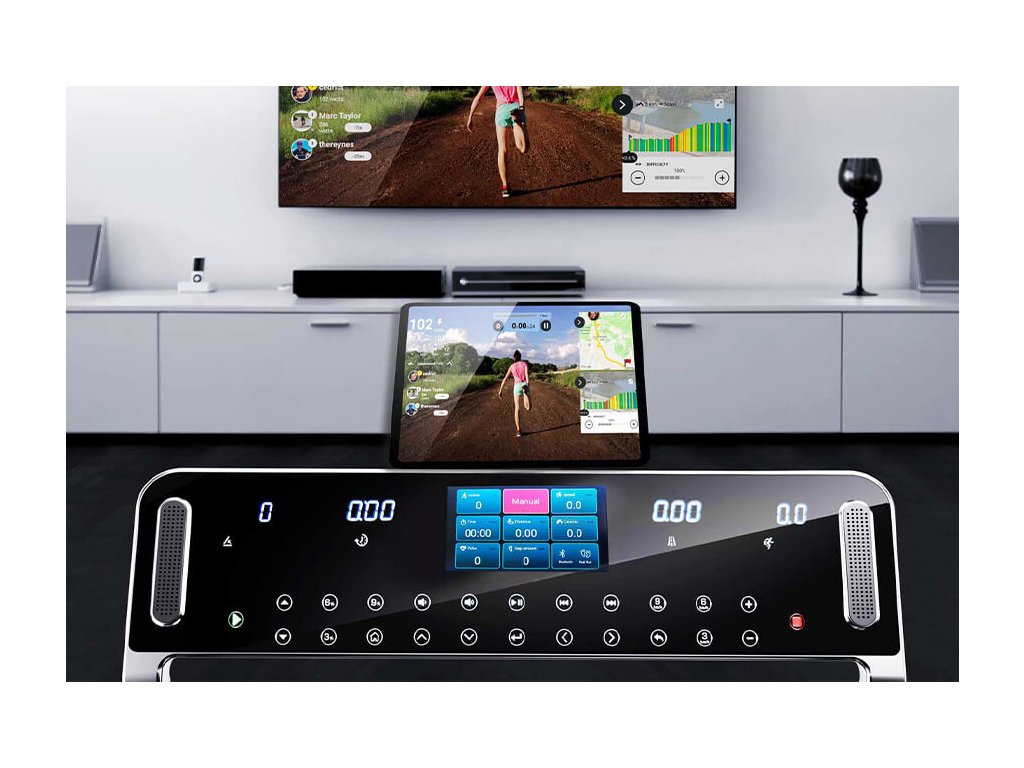 Pomocou pripojenia Bluetooth môžete virtuálne trénovať s TM 5000S a aplikáciou Kinomap. Z veľkého výberu rôznych trás môžete kedykoľvek začať svoju obľúbenú prehliadku a preskúmať okolie. Integrovaný reproduktorový systém a výsuvný držiak pre tablety a smartfóny dopĺňajú možnosti tréningu.
