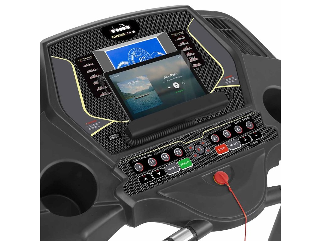 Konzola bežeckého pásu Exess14,5 je vybavená držiakom na tablet, integrovanými reproduktormi s MP3 zásuvkou a vstupom na USB kľúč. Rozmery Exess 14,5 tiež zaručujú výkonné cvičenie aj pre tých najtrénovanejších. Bežecká plocha má rozmery 58x150 cm a motor s výkonom 3,5 HP vám umožní dosiahnuť rýchlosť 22 km/h. Bežecká plocha, odpružená 8 elastomérmi, sa dá elektricky nakloniť až o 20 %.