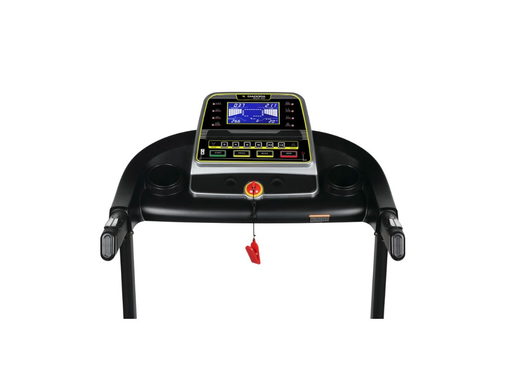 Bežecký pás Diadora Rewo 300 je moderný bežecký pás ideálny na cvičenie v pohodlí domova. Pás ponúka odpruženú bežeckú plochu a motor s výkonom 1,75 HP. Medzi jeho prednosti patrí možnosť nastavenia rýchlosti priamo z ovládacieho panela a počúvanie hudby na vstavaných reproduktoroch po pripojení MP3 prehrávača. Súčasťou pásu je podsvietený LCD displej a bezpečnostný kľúč, ktorý po vytiahnutí z monitora pre vašu bezpečnosť okamžite zastaví bežecký pás. Pevná a kvalitná konštrukcia ponúka maximálnu hmotnosť užívateľa 120 kg. Po tréningu pás ľahko zložíte a pomocou transportných koliesok jednoducho premiestnite na iné miesto.