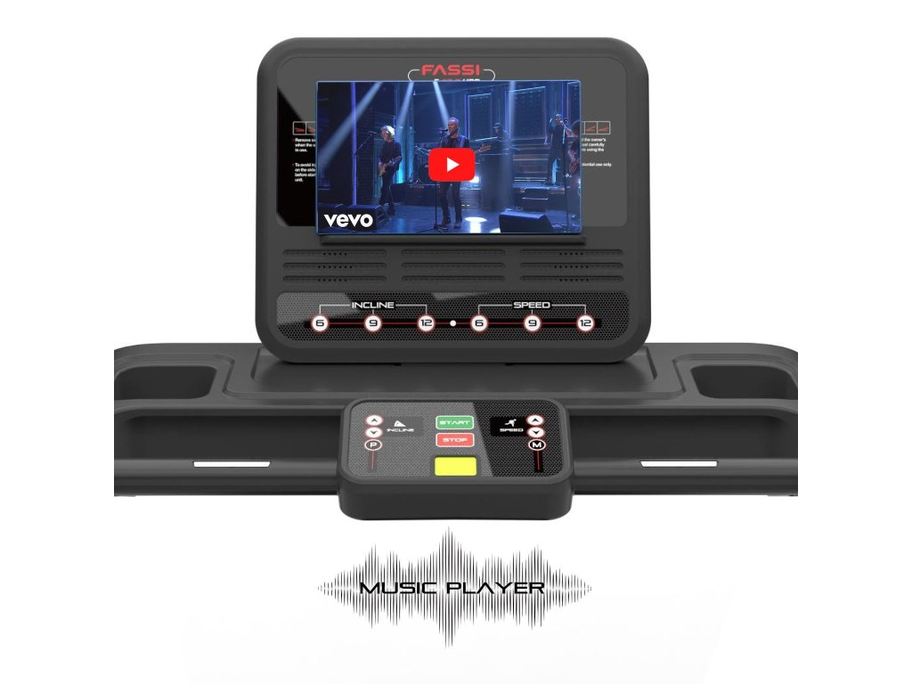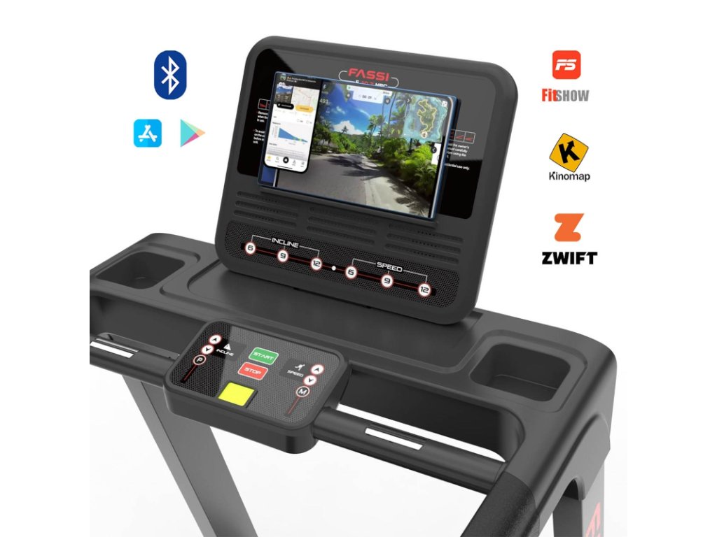 Bežecký pás Fassi F10.7 je tiež vybavený Bluetooth konektivitou, ktorá vám umožňuje využívať výhody špeciálneho držiaka na tablet a integrovaných reproduktorov na počúvanie a sledovanie multimediálneho obsahu počas používania bežiaceho pásu.