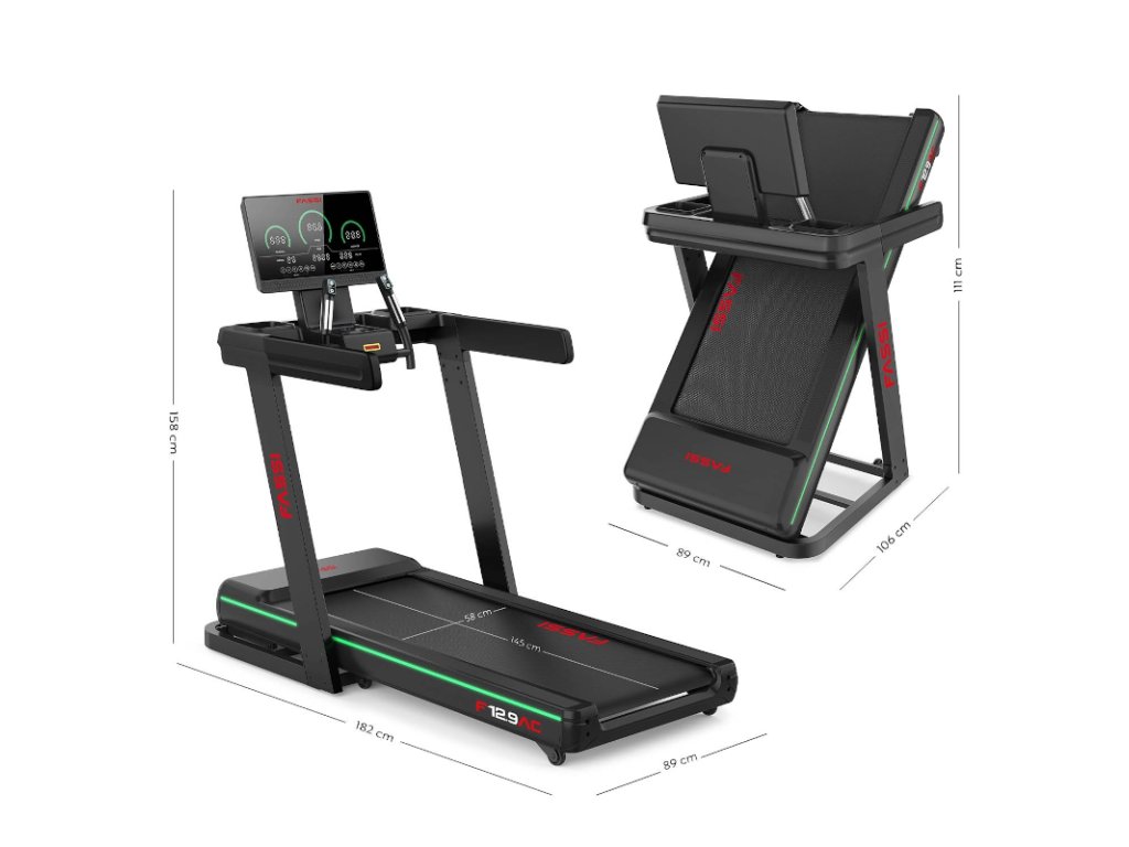 Charakteristickým prvkom bežeckého pásu F 12.9 AC je svetelná čiara pod bežeckou doskou, ktorá mení farbu a informuje o stave zariadenia: červená pri behu a zelená pri pozastavení. Tento detail nielenže dodáva dizajnu moderný nádych, ale zároveň zlepšuje použiteľnosť. Bežecký pás je vybavený pripojením Bluetooth, zabudovanými reproduktormi na počúvanie hudby a funkciou bezdrôtového nabíjania smartfónov.
