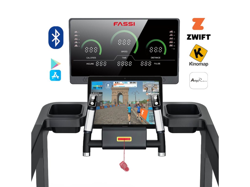 Tento model je vybavený pokročilým dotykovým LED displejom, ktorý uľahčuje sledovanie kľúčových štatistík, ako je rýchlosť, vzdialenosť a spálené kalórie, vďaka čomu môžete jednoducho riadiť svoj pokrok. Vďaka 45 prednastaveným tréningovým programom vrátane 36 kombinácií rýchlosti a sklonu, 3 cieľovým programom pre konkrétne ciele a 3 HRC programom založeným na srdcovej frekvencii je trenažér Fassi F 12.9 AC ideálny pre používateľov všetkých úrovní fyzickej zdatnosti. Bežecký pás je kompatibilný s fitness aplikáciami AnyRun, Kinomap a Zwift, ktoré vám umožňujú preskúmať virtuálne trasy a udržať si vysokú motiváciu.