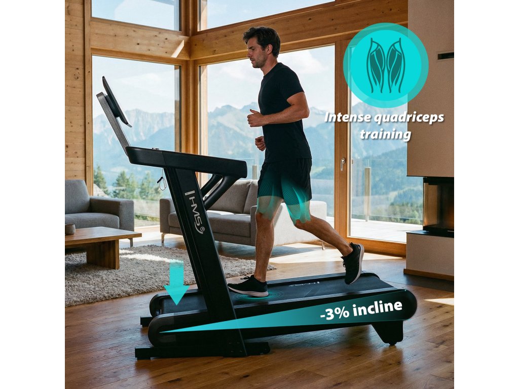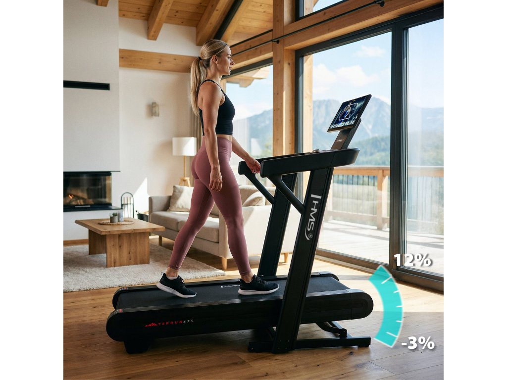 Bežecký pás TERRUN475 disponuje obojsmerným sklonom v rozsahu od -3 % do 12 %, ktorý umožňuje realistickú simuláciu zbehov aj prudkých výbehov. Tréning tak pripomína beh v horách alebo na členitých lesných chodníkoch a intenzívne zapája svaly nôh, sedacích svalov aj stredu tela (core).