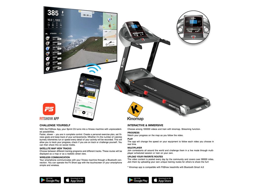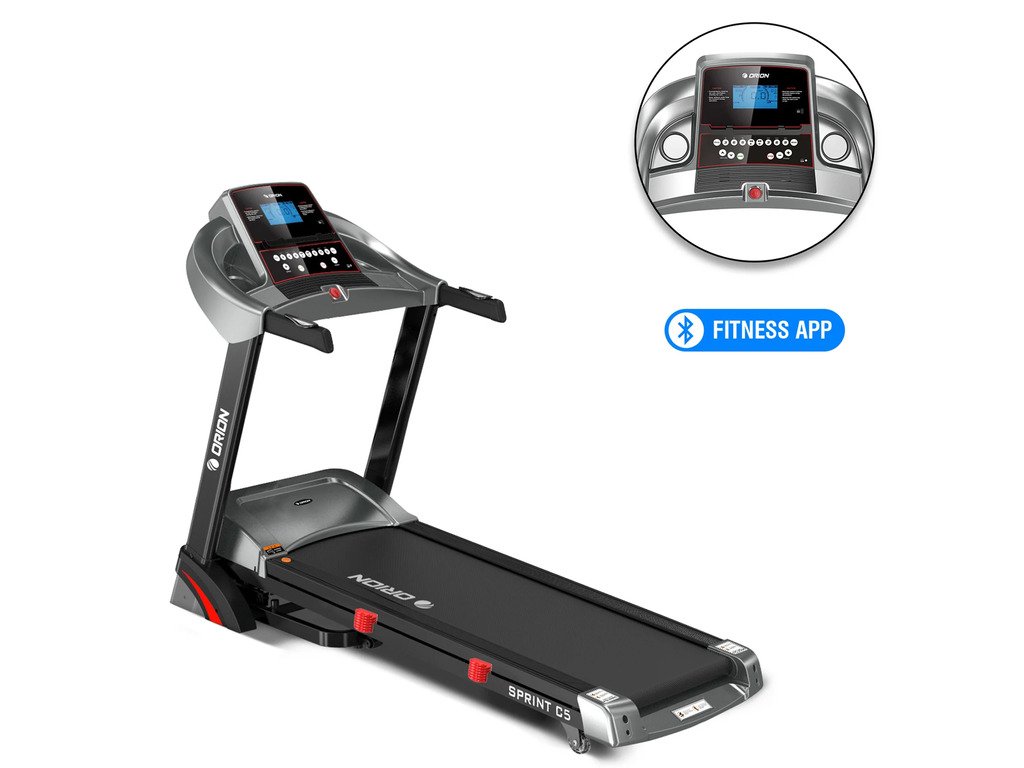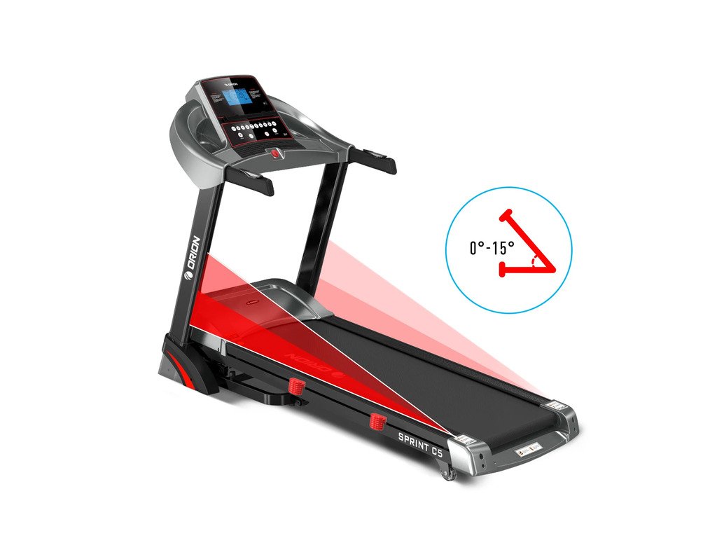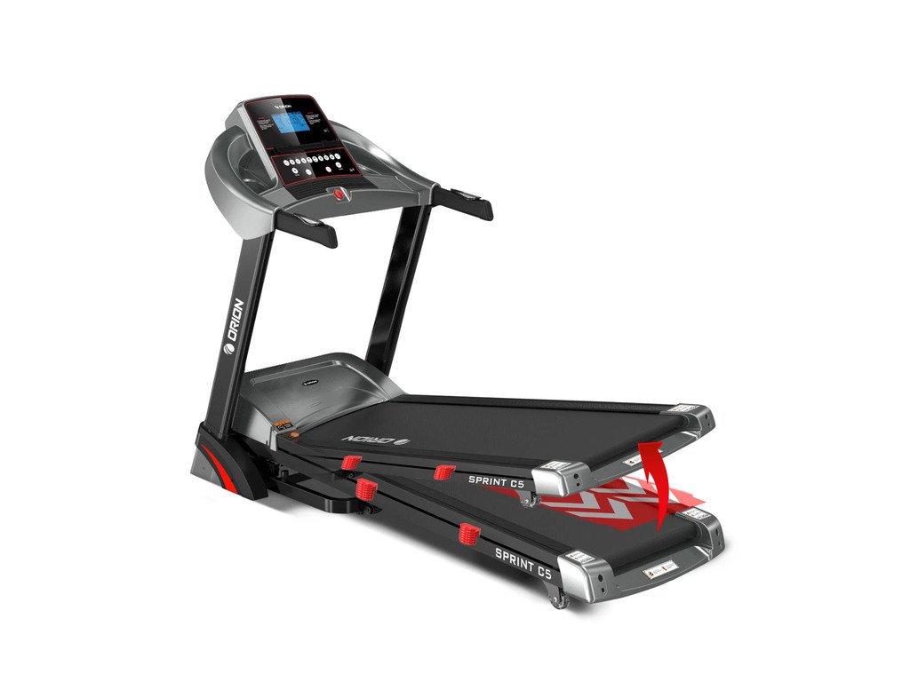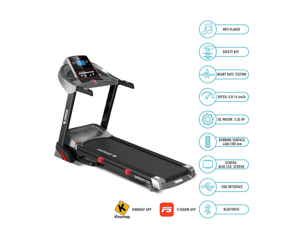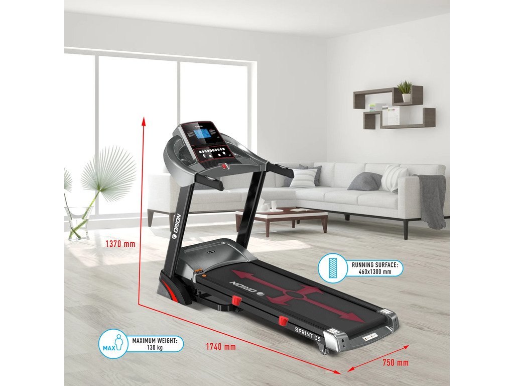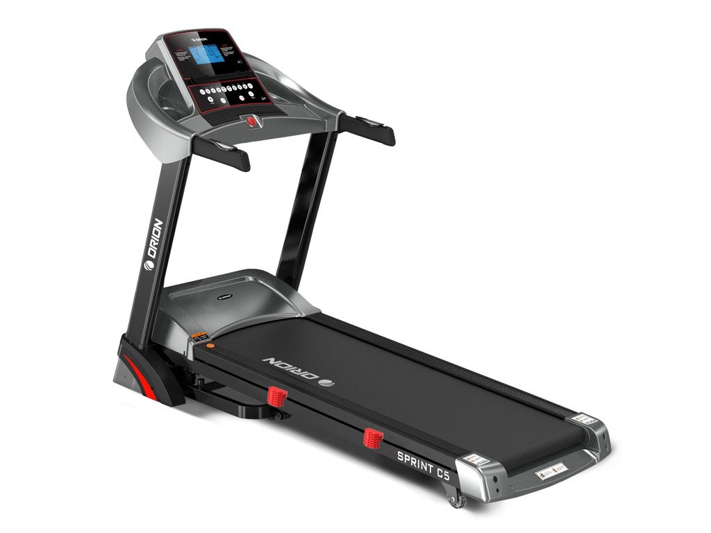 Orion Sprint C5 je elektrický bežecký pás pre domáce použitie, vybavený výkonným motorom s výkonom 3,25 HP, ktorý umožňuje používateľom behať rýchlosťou od 0,8 do 16 km/h. Tento bežecký pás je vybavený automatickým sklonom s 15 úrovňami, ktoré je možné nastaviť manuálne alebo pomocou tlačidiel INCLINE +/- na rukoväti.