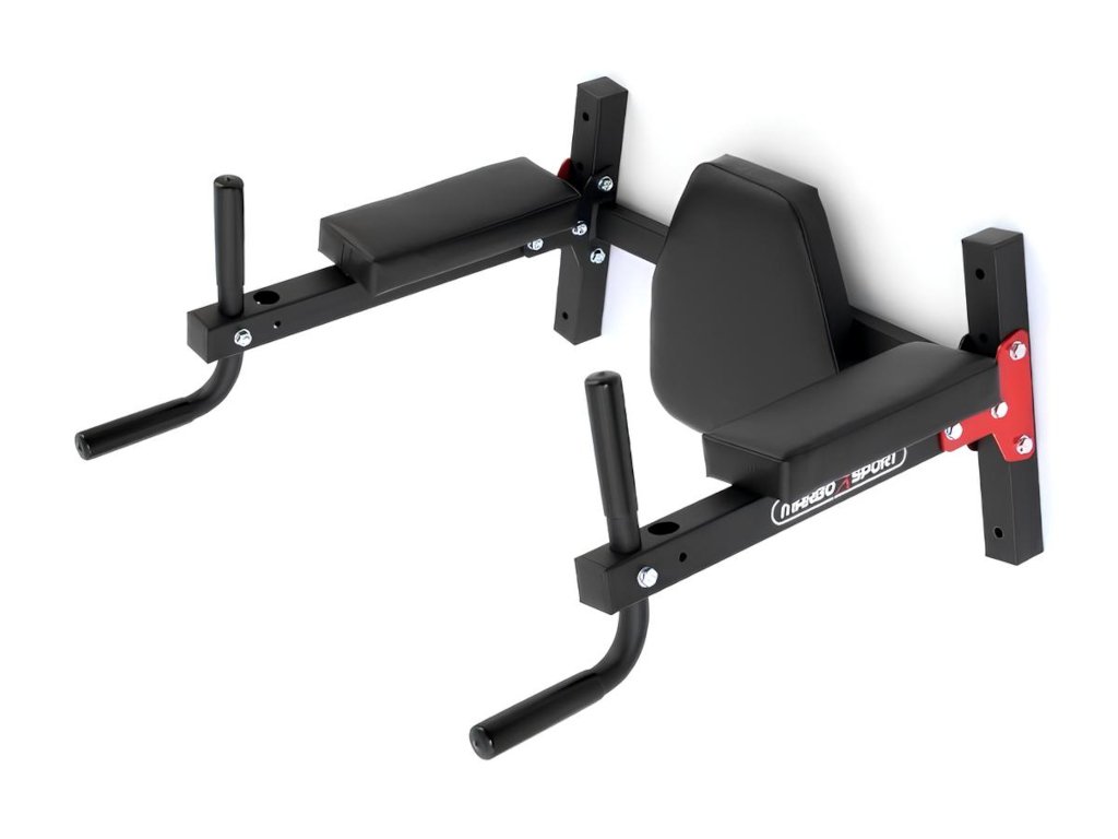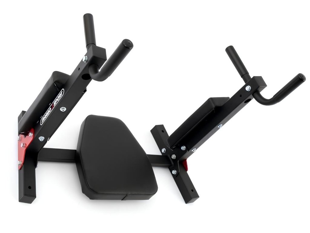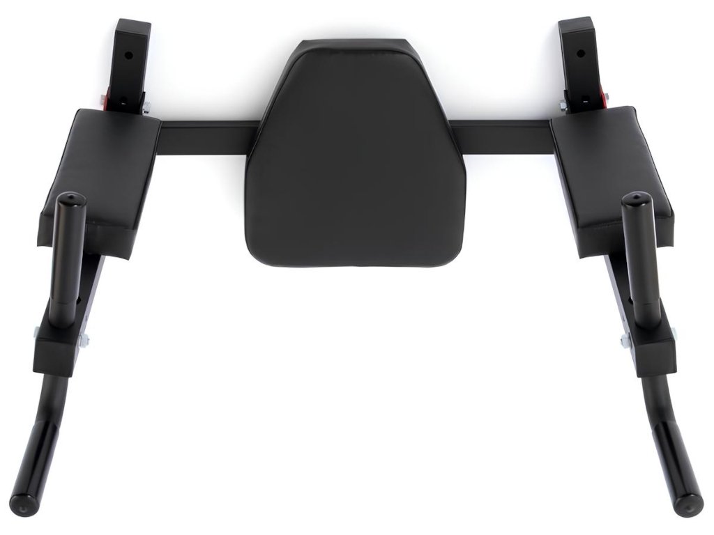 Nastaviteľné madlá s plastovými návlekmi slúžia zároveň ako podpery pre tréning dipov. O komfort sa starajú polstrované lakťové opierky a robustná chrbtová opierka.