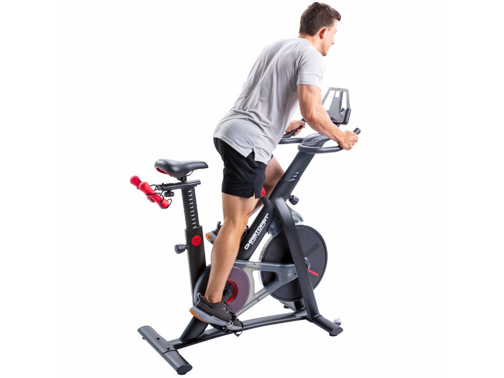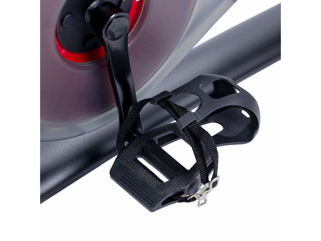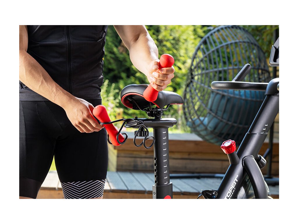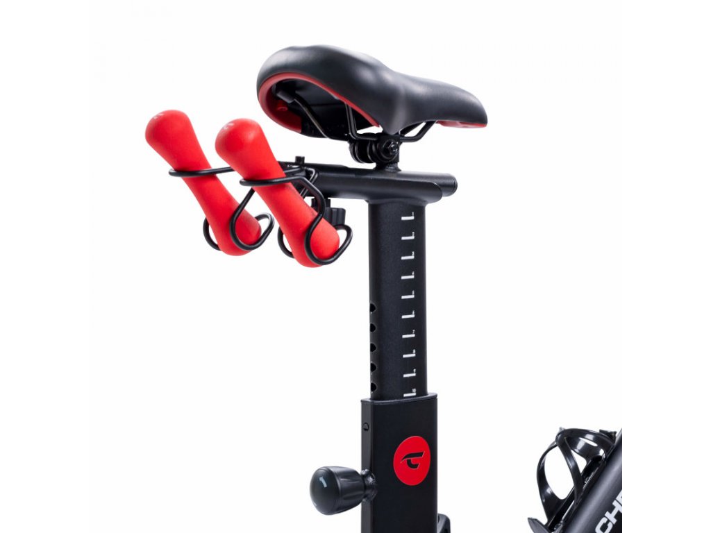 S čiernym dizajnom s červenými akcentmi bicykel upúta pozornosť. Držiak činiek s 2 x 1 kg činkami je umiestnený v zadnej časti sedadla.