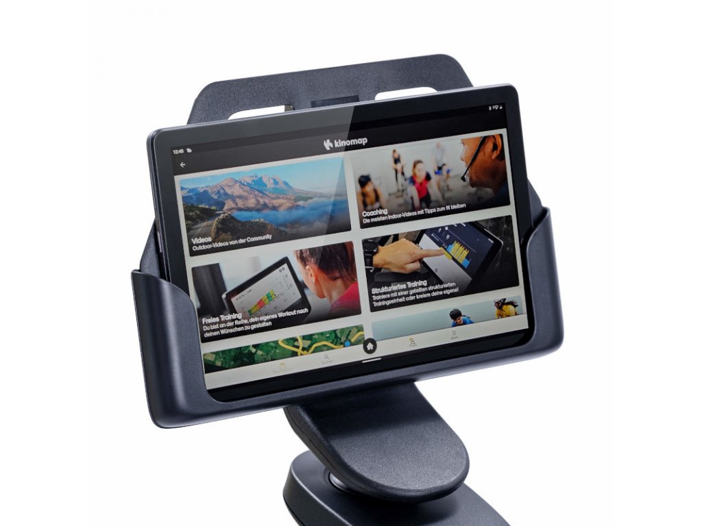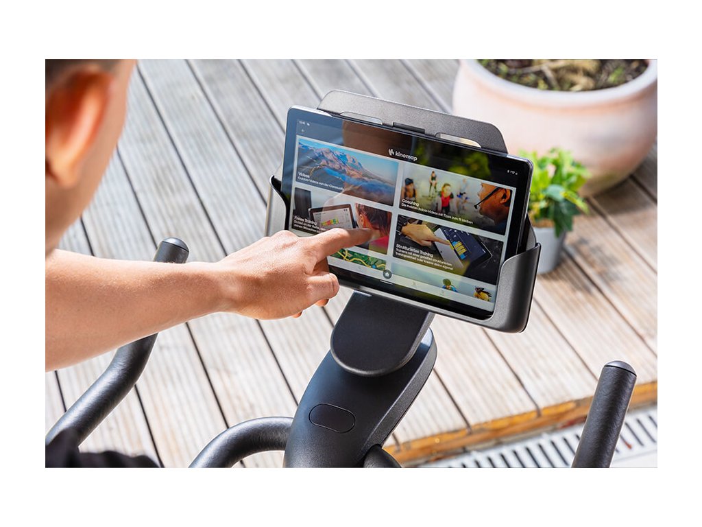 Držiak na tablet alebo smartfón zaisťuje zábavný a pohodlný tréning. Použite svoj smartfón alebo tablet, sledujte svoje obľúbené seriály alebo sa pripojte k aplikácii Kinomap.