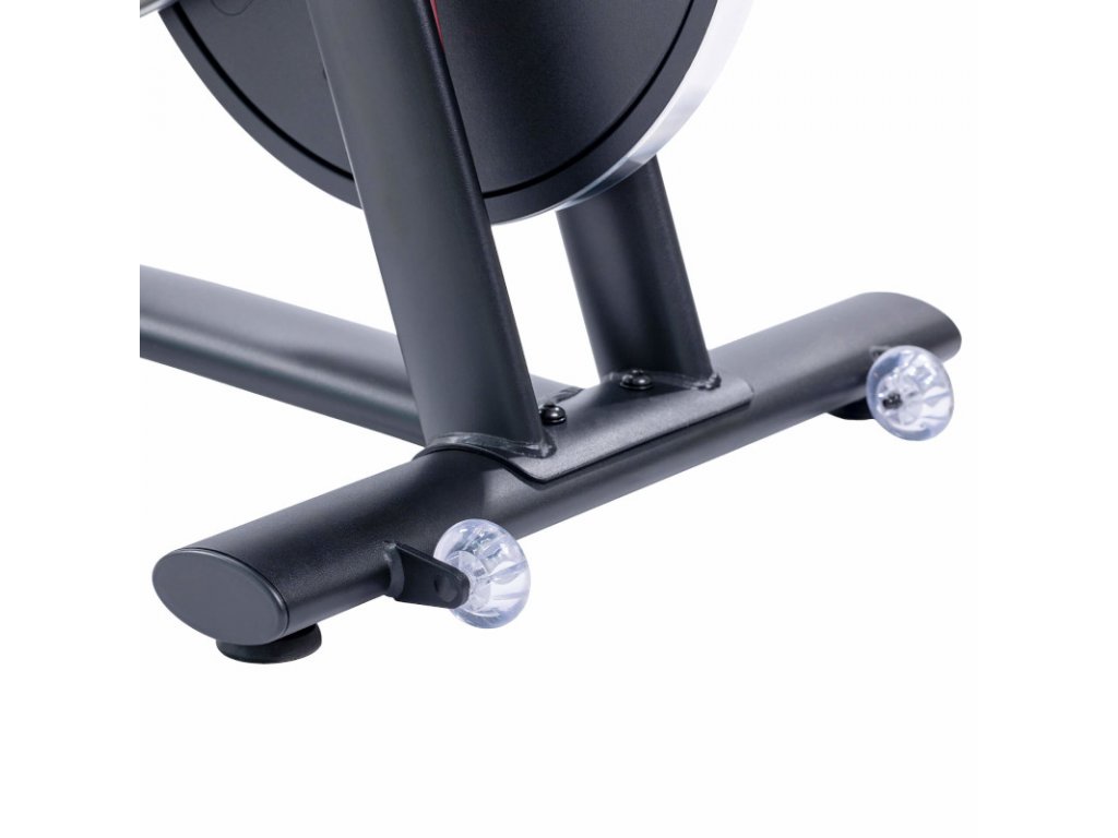 Predné transportné kolesá uľahčujú zmenu polohy a zadné, výškovo nastaviteľné kryty nôh zaisťujú, že bicykel stojí bezpečne.