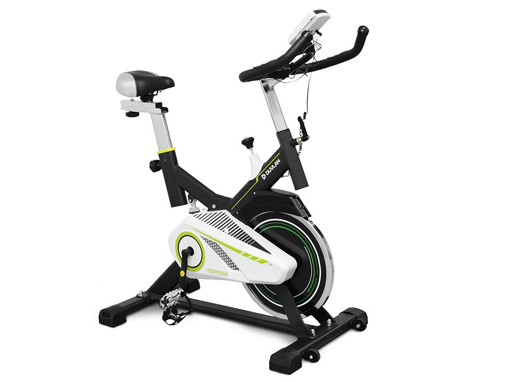 Cyklotrenažér DUVLAN Topeca je vďaka svojej cene a kvalite jedným z najobľúbenejších cyklotrenažérov vo svojej triede. V robustnej oceľovej konštrukcii je osadené záťažové koleso s hmotnosťou 13 kg, ktoré brzdíte pomocou trecej brzdy. Na riadidlách je umiestnený počítač na ktorom sa dozviete všetky dôležité údaje o Vašom cvičení. Riadidlá sú výškovo nastaviteľné, sedadlo je nastaviteľné horizontálne aj vertikálne takže si oveľa lepšie nastavíte správnu polohu pre pohodlný tréning. Systém vyrovnávania nerovností podlahy sú umiestnené na oboch stabilizátoroch a pre jednoduchý presun cyklotrenažéra slúžia transportné kolieska.