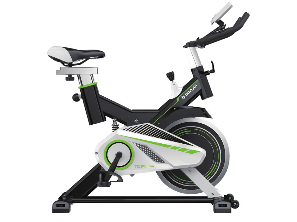 Cyklotrenažér DUVLAN Topeca je vďaka svojej cene a kvalite jedným z najobľúbenejších cyklotrenažérov vo svojej triede. V robustnej oceľovej konštrukcii je osadené záťažové koleso s hmotnosťou 13 kg, ktoré brzdíte pomocou trecej brzdy. Na riadidlách je umiestnený počítač na ktorom sa dozviete všetky dôležité údaje o Vašom cvičení. Riadidlá sú výškovo nastaviteľné, sedadlo je nastaviteľné horizontálne aj vertikálne takže si oveľa lepšie nastavíte správnu polohu pre pohodlný tréning. Systém vyrovnávania nerovností podlahy sú umiestnené na oboch stabilizátoroch a pre jednoduchý presun cyklotrenažéra slúžia transportné kolieska.