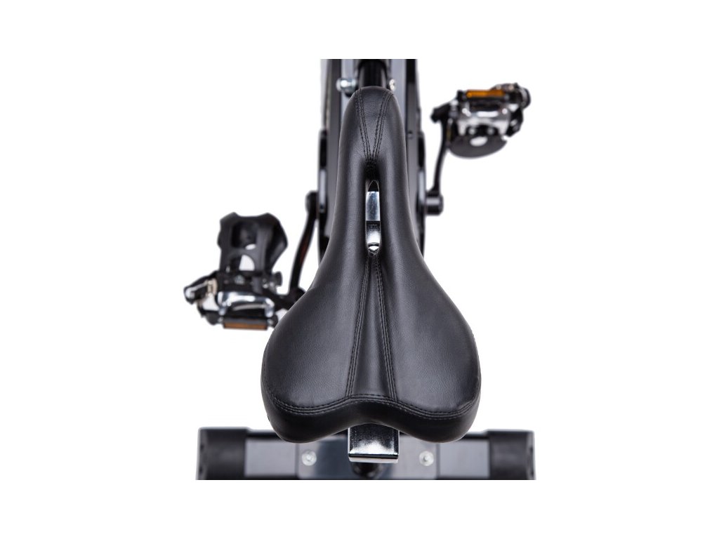 Zadné rameno, ktoré nesie sedlo, je opatrené tlmičom, ktorý má za účel zvýšiť užívateľský komfort a oceníte ho hlavne pri vysokých rýchlostiach. Na oceľových pedáloch sú osadené košíky s nastaviteľným remienkom. Toto riešenie umožňuje použitie akejkoľvek topánky. Predný stabilizátor s transportnými kolieskami umožňuje jednoduché presúvanie a uskladnenie trenažéra, ak práve nie je využívaný. Oba stabilizátory sú potom opatrené výškovo nastaviteľnými skrutkami pre vyrovnanie trenažéra do roviny aj na nerovnej podlahe.