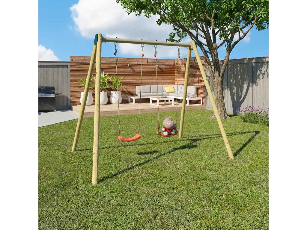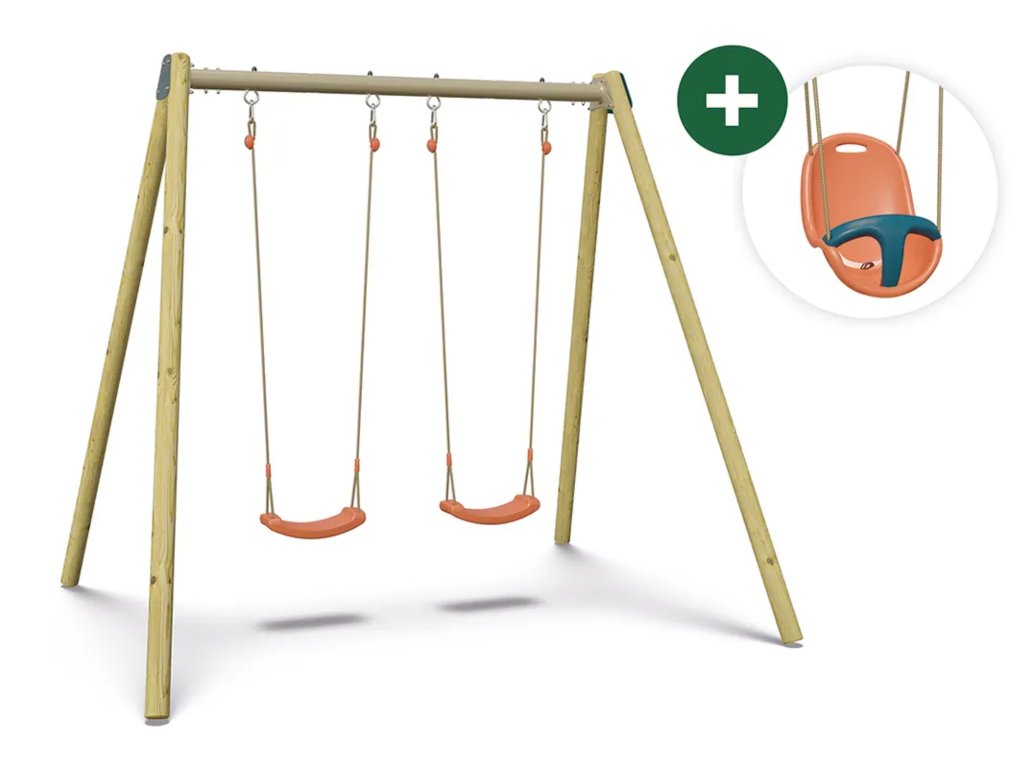 Táto hojdačka je ideálnym riešením pre menšie záhrady. Je vybavená dvomi hojdačkami, no vďaka priloženej detskej sedačke môžete jednoducho meniť výbavu. To nielen rozvíja detskú fantáziu, ale zároveň podporuje učenie a pohybové schopnosti.