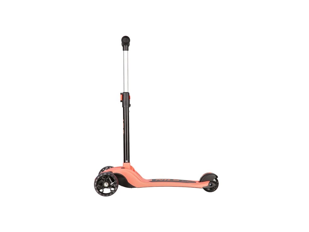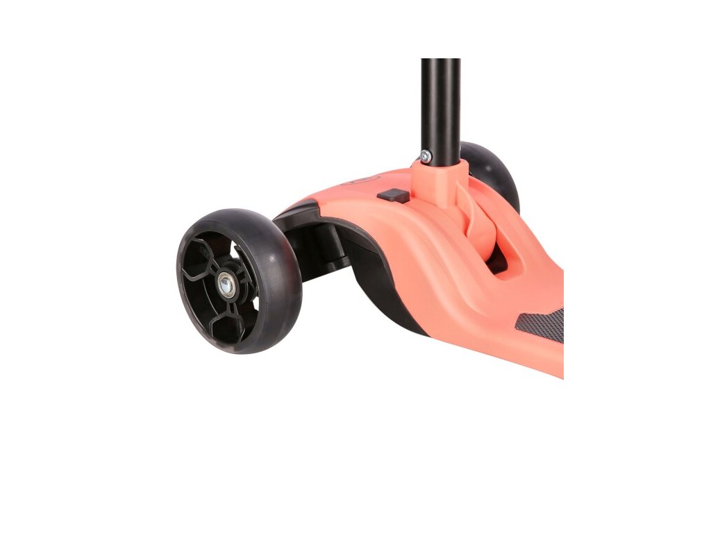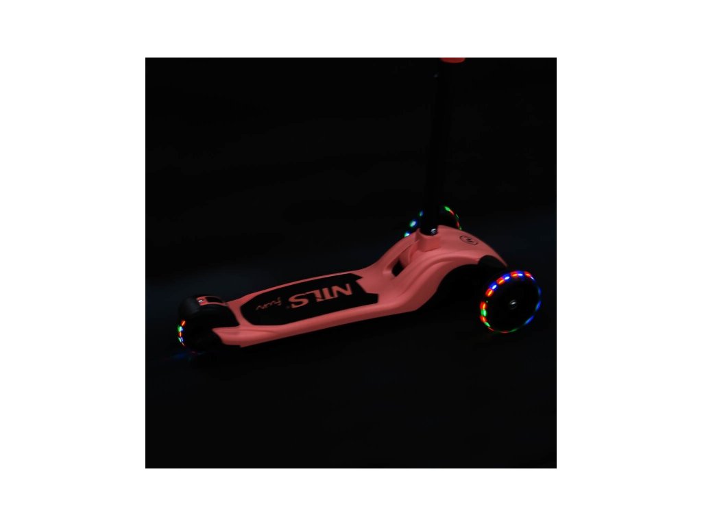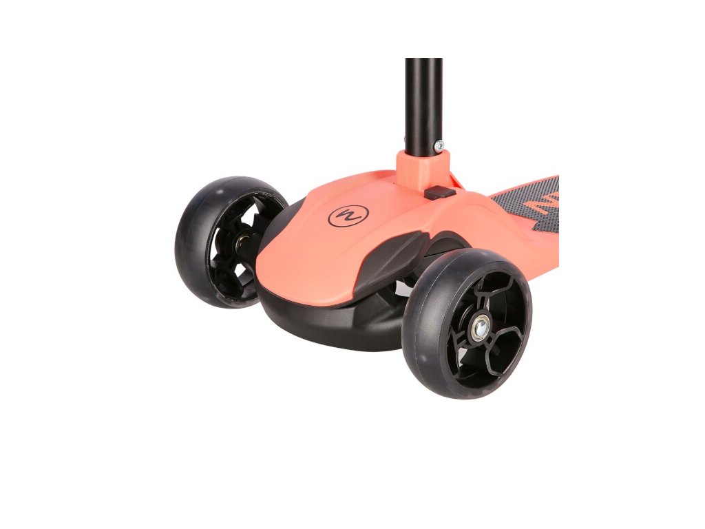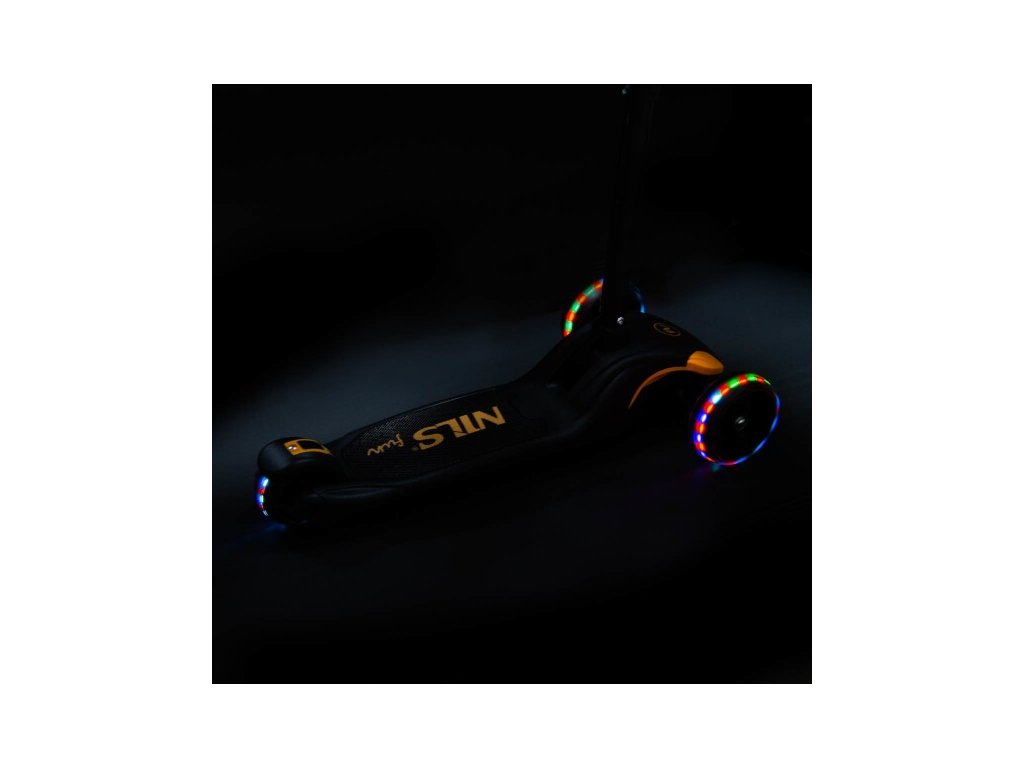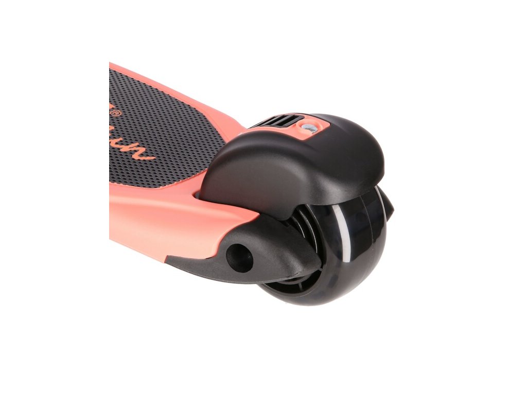 Predné kolieska sú široké 40 milimetrov a zadné kolieska sú široké 50 milimetrov. Kolieska sú vybavené ložiskami ABEC 7 pre hladkú jazdu a sú tiež vybavené svietiacimi LED diódami, ktoré slúžia ako zaujímavý, vizuálny prvok, zvyšujú záujem detí a v neposlednom rade zvyšujú viditeľnosť kolobežky napríklad za súmraku. Kolieska sa automaticky rozsvietia, keď sa kolobežka otáča. Zadný blatník slúži ako nášľapná brzda na bezpečné zastavenie kolobežky.
