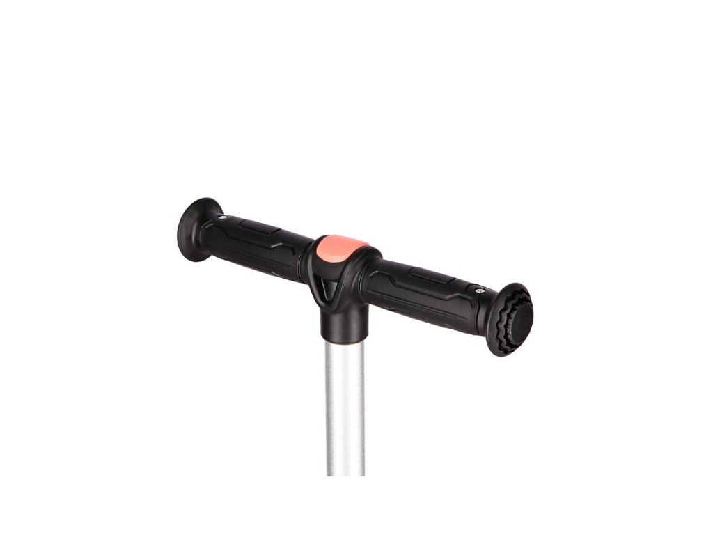 Teleskopické riadidlá sú výškovo nastaviteľné v 4 polohách (63-68-73-78 cm od zeme a 57-62-67-72 cm od opierky nôh). Výškové nastavenie sa mení uvoľnením páčky na robustnej objímke, stlačením aretačného kolíka a vysunutím alebo zasunutím vnútornej tyče riadidiel. Na úsporu miesta možno riadidlá sklopiť - na tento účel stlačte tlačidlo vedľa riadidiel a potom ich posuňte nahor. Tento systém skladania je mimoriadne bezpečný a počas jazdy sa nedá náhodne zložiť. Rukoväte na riadidlách sú vyrobené z plastu s drážkami pre pevný úchop. Konce rukovätí sú vybavené "klobúčikom", ktorý zabraňuje skĺznutiu dlane z rukoväte a tiež chráni dlaň, ak dieťa náhodou narazí riadidlami do prekážky - napríklad do fasády domu alebo stĺpika dopravnej značky. Šírka riadidiel je 26 cm a využiteľná šírka (priestor pre ruky) je 23 cm.