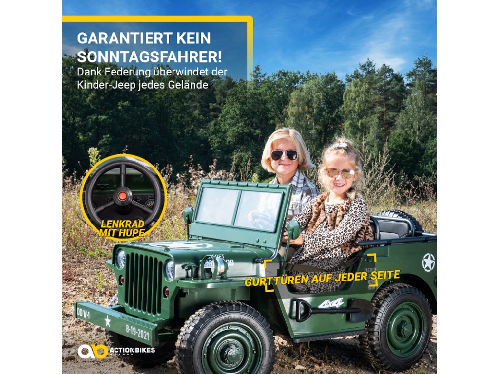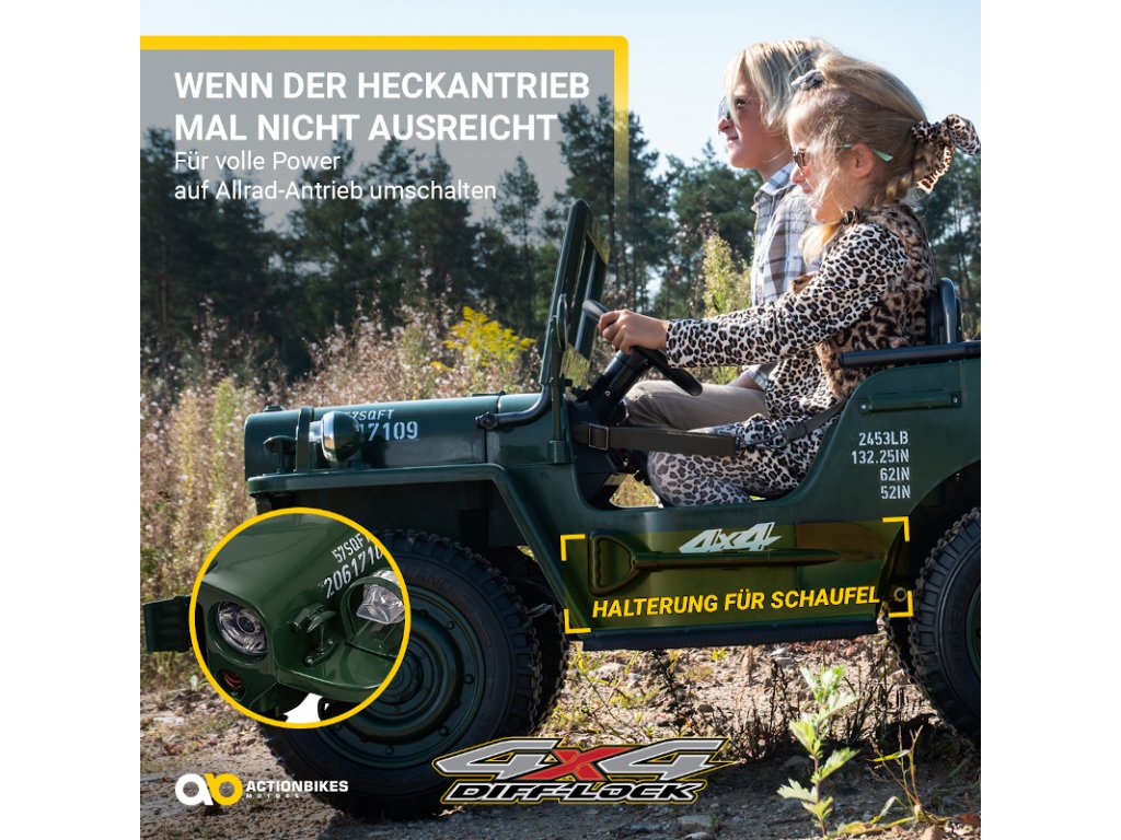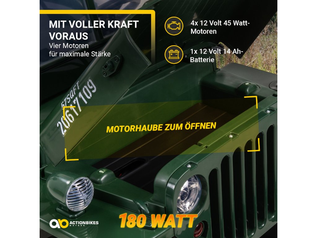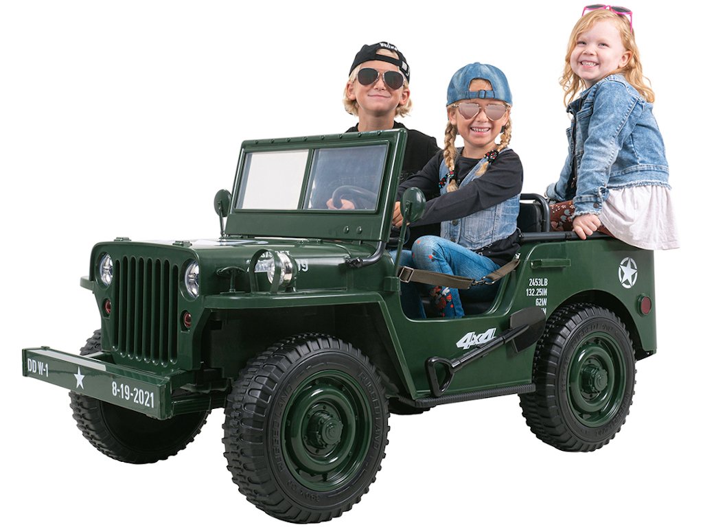 Na rozdiel od väčšiny iných detských elektromobilov ponúka Jeep Willys priestor pre troch malých vodičov. Väčšia konštrukcia vyžaduje dostatočný výkon pre rýchlu jazdu. Preto je detské autíčko vybavené štyrmi 12-voltovými motormi s maximálnym výkonom 45 wattov (spolu 180 wattov). Auto boduje rýchlosťou až 6 km/h. Pohon 4x4 prepraví detské terénne auto bezpečne cez akýkoľvek terén.