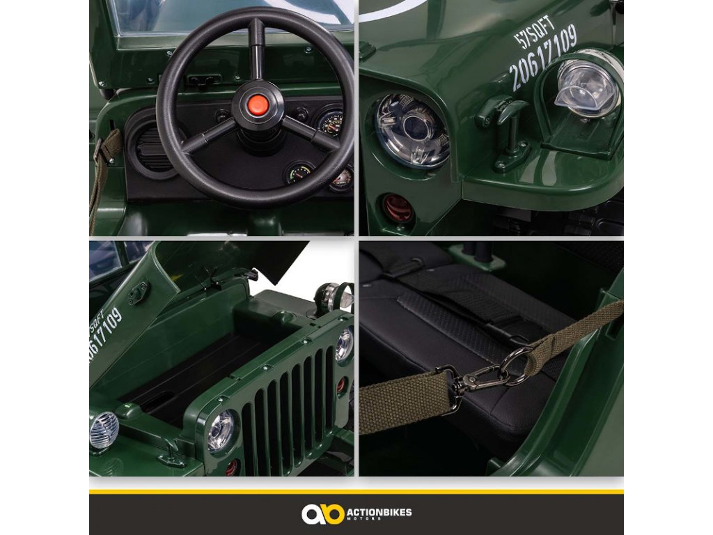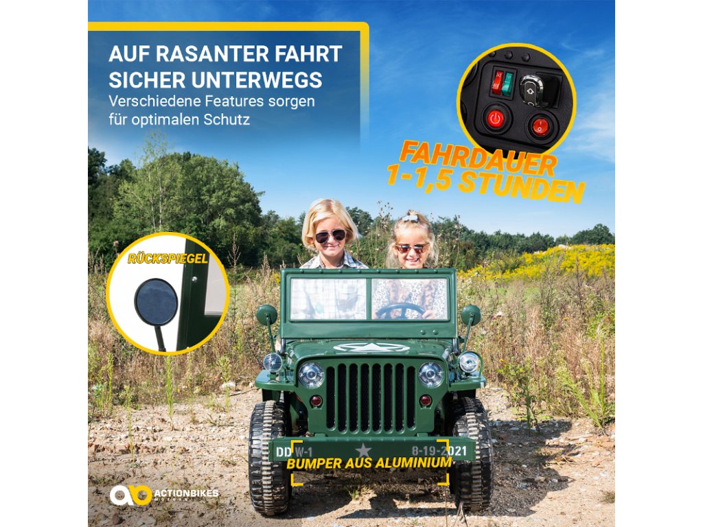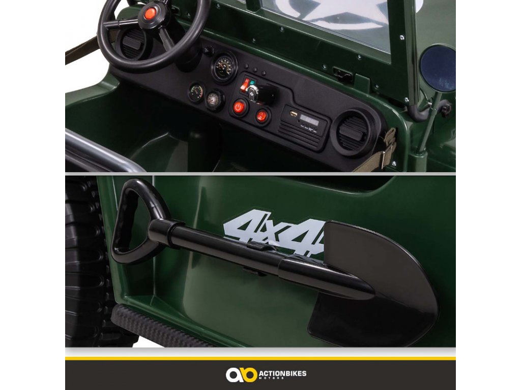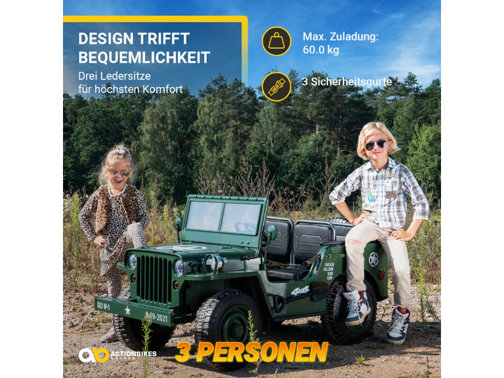 Na rozdiel od väčšiny iných detských elektromobilov ponúka Jeep Willys priestor pre troch malých vodičov. Väčšia konštrukcia vyžaduje dostatočný výkon pre rýchlu jazdu. Preto je detské autíčko vybavené štyrmi 12-voltovými motormi s maximálnym výkonom 45 wattov (spolu 180 wattov). Auto boduje rýchlosťou až 6 km/h. Pohon 4x4 prepraví detské terénne auto bezpečne cez akýkoľvek terén.