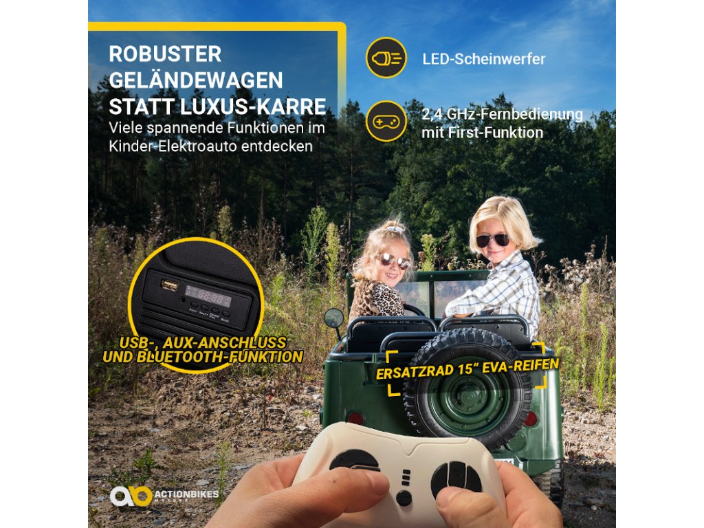 15 -palcové plné gumové pneumatiky EVA zaisťujú správnu priľnavosť a odpruženie zaisťuje pohodlnú jazdu. Detské terénne auto ponúka priestor pre troch malých dobrodruhov vo veku od troch do siedmich rokov. Samozrejme nesmie chýbať potrebné náradie na výpravu. Preto auto ponúka v rôznych priehradkách dostatok úložného priestoru na náradie, zásoby atď..