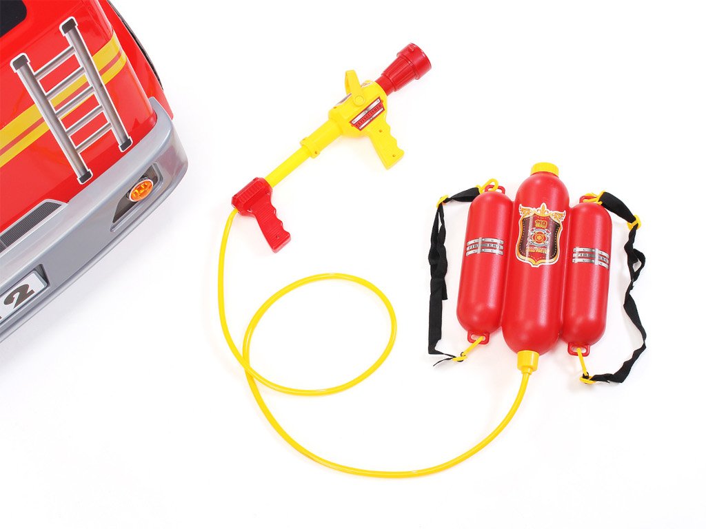 Detské elektrické hasičské auto LL911 sa dodáva s nádržou na vodu. Dá sa pripevniť na zadnú časť auta. Vodná hadica funguje ako veľká vodná pištoľ. Jednoducho naplňte nádržku na vodu vodou z vodovodu.