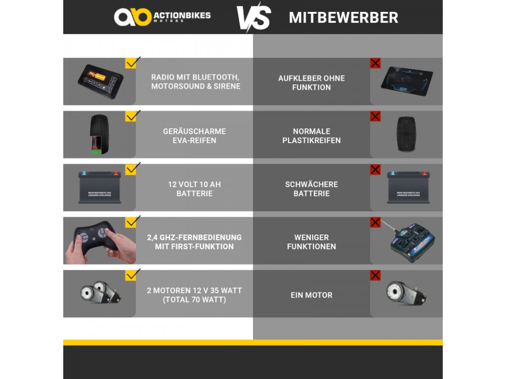 - ďalšie funkcie: mäkký štart, funkcia stúpania, posilňovač riadenia, LED v ráfikoch, rádio s funkciou Bluetooth