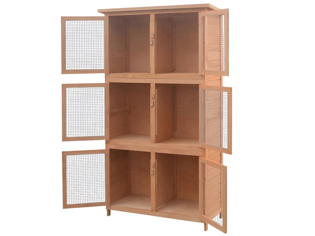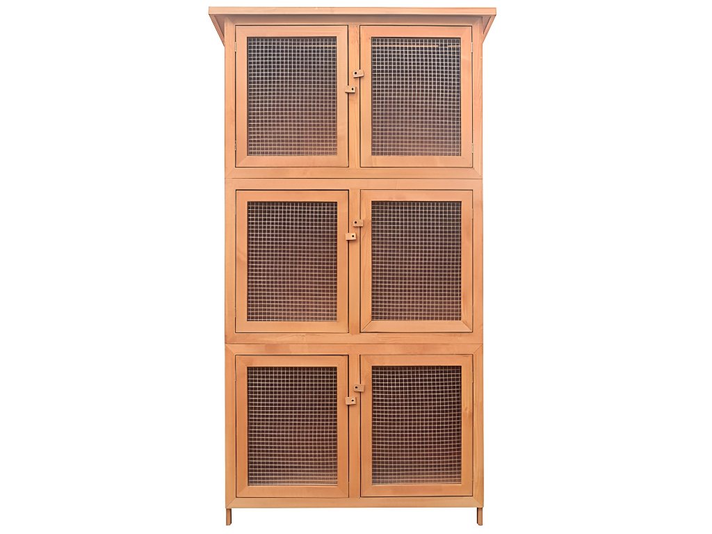 Klasická králikáreň s tromi poschodiami. Na každom poschodí sa nachádzajú dva koterce 45 cm široké a 51 cm vysoké. Celkom teda poskytne prístrešie pre 6 ušiakov.