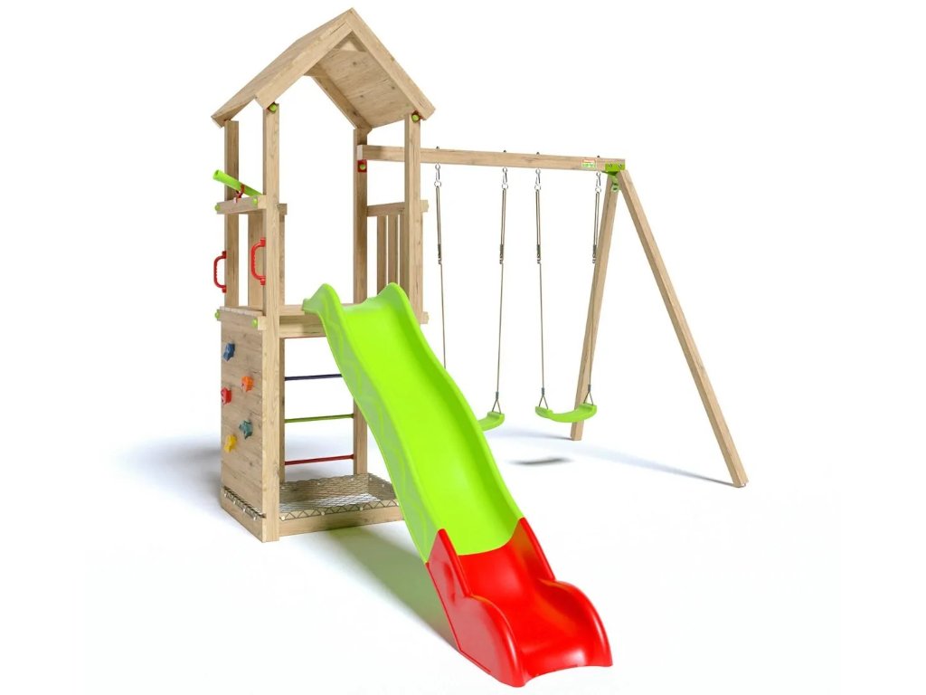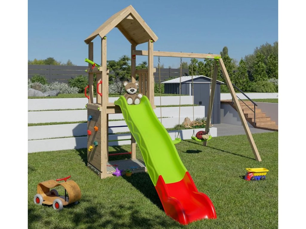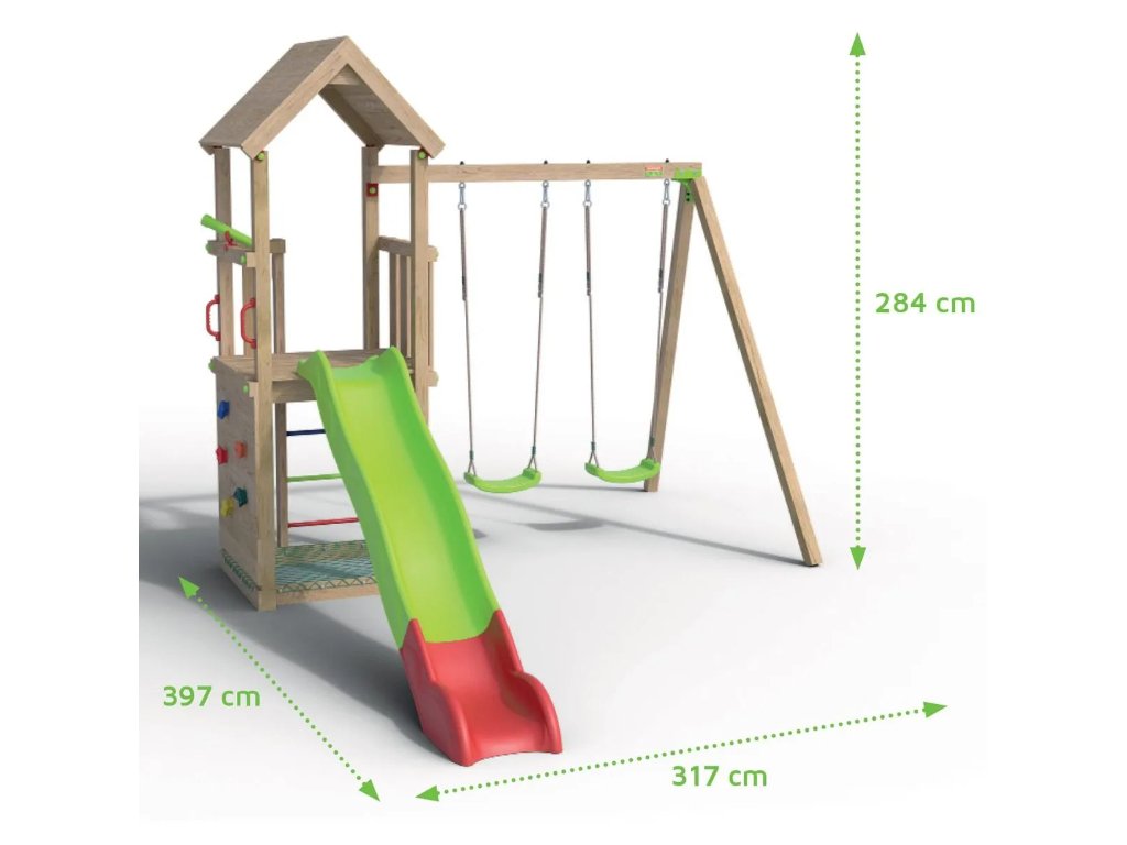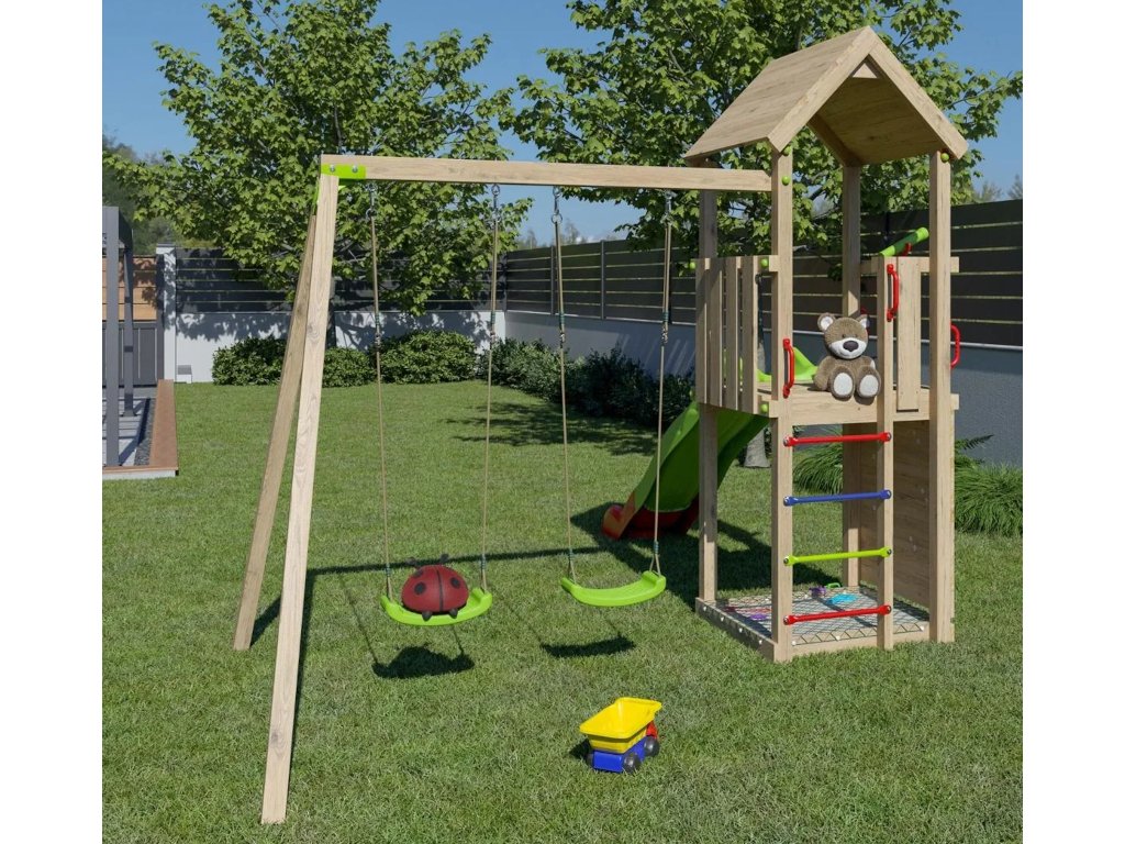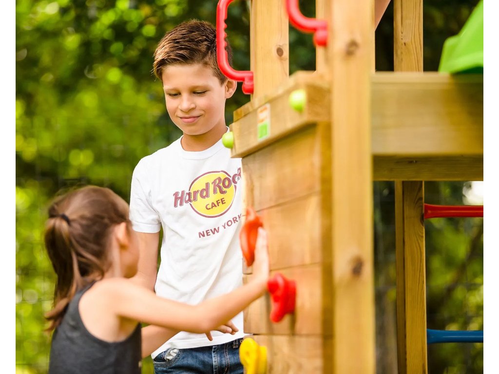 Toto ihrisko so svojím naozaj pekným vzhľadom a zábavnými aktivitami ponúka množstvo aktivít a môže sa na ňom hrať až 7 detí vo veku od 3 do 12 rokov. Tí starší si z vrchu hracej veže užijú hry vonku so svojimi kamarátmi pre chvíle plné smiechu a zábavy. Najmenší sa zabavia na pieskovisku, vďaka ktorému prežijú príjemné chvíle strávené na piesku. Súčasťou je ochranná sieť, ktorá chráni piesok pred zvieratami, aby sa deti mohli bezpečne hrať. Na šmykľavke môžu tiež jednoducho zažiť pôžitok zo šmýkania. Vďaka lezeckej stene sa na plošinu dostanú aj malí záhradní dobrodruhovia, pričom rozvíjajú svoju obratnosť a pohyblivosť.