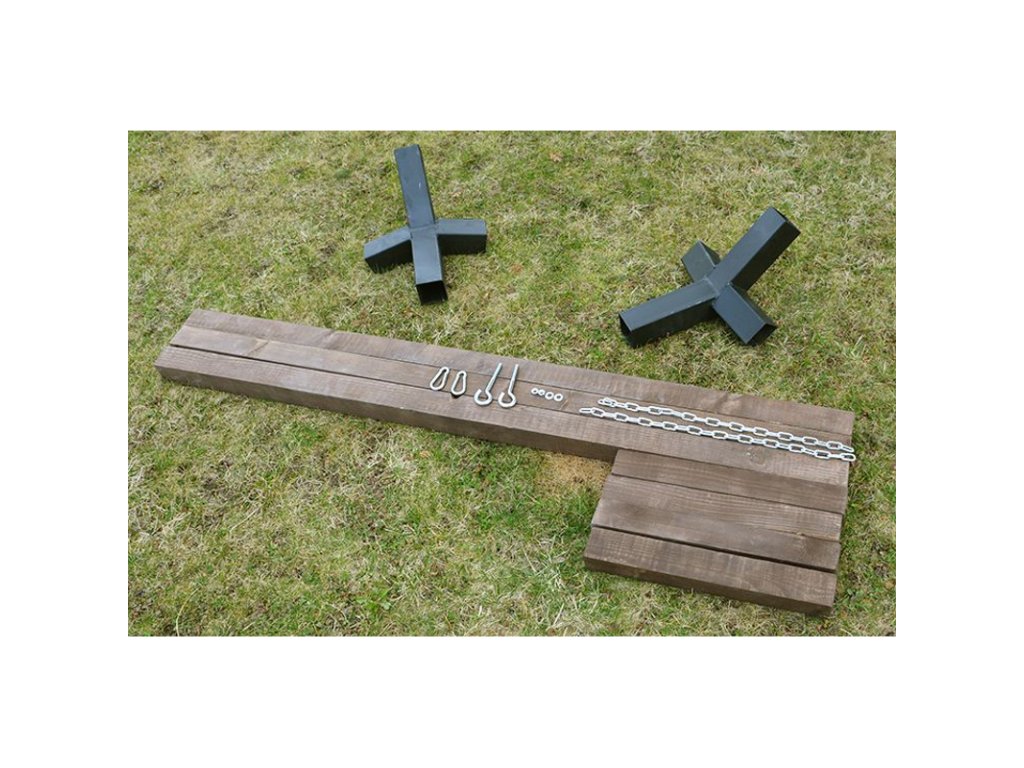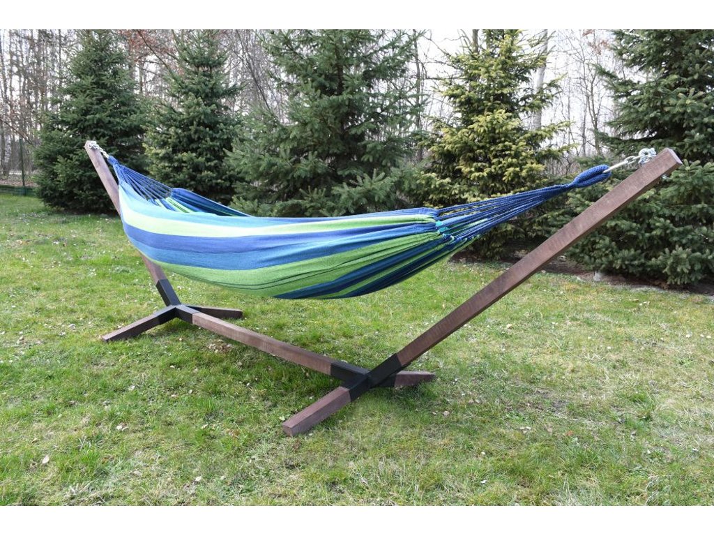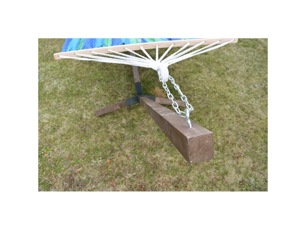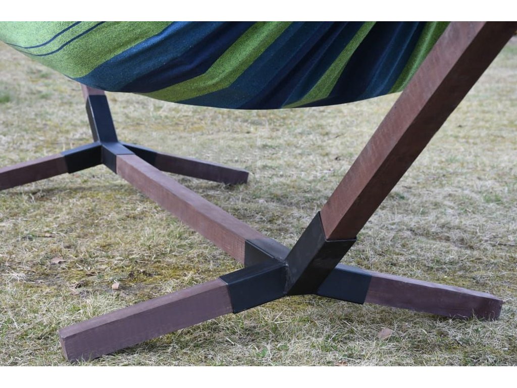 Rám je vyrobený z kvalitného sušeného dreva, ktoré je chránené lakom. Vďaka tomu je celý stojan odolný voči poveternostným podmienkam. Kovové prvky spájajúce drevené hranoly sú pokryté antikoróznou farbou. Sada obsahuje háky, reťaze a karabíny, ktoré umožňujú uchytenie hojdacej siete.