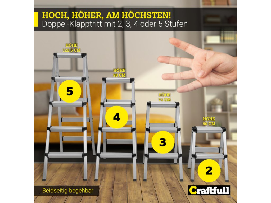 Rebrík Craftfull CF-131A je dostupný v štyroch veľkostiach. Skladací schodík s 2 schodíkmi zaujme výškou 50 cm, verzia s 3 schodíkmi má výšku 74 cm. Rebrík so 4 schodíkmi vám ponúka veľkosť 98 cm. To ti nestačí?