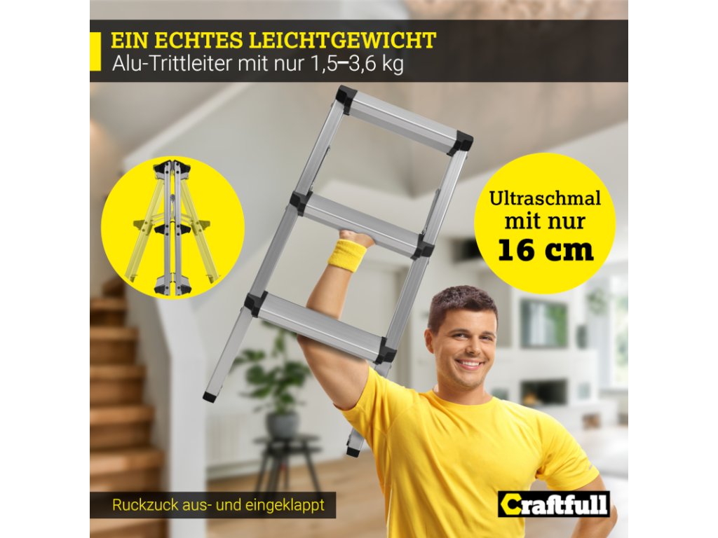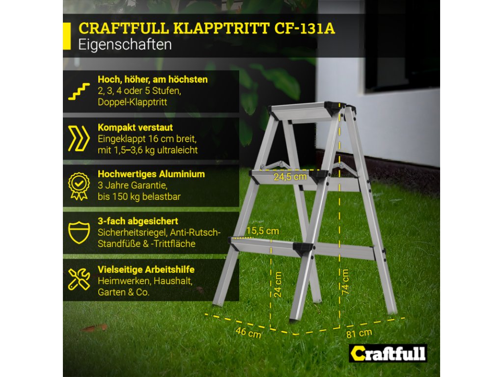 Pri rebríku Craftfull CF-131A majú vnútorné hodnoty osobitný vplyv na kvalitu. Pretože dvojitý schodík je vyrobený z robustného a ľahko udržiavateľného hliníka. To z neho robí špeciálny druh ľahkého schodiska, podľa počtu schodíkov váži len 1,5 kg až 3,61 kg. Vďaka tomu je preprava obzvlášť príjemná!