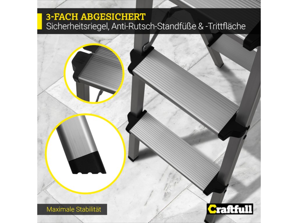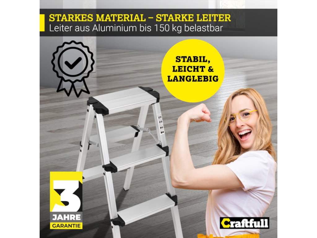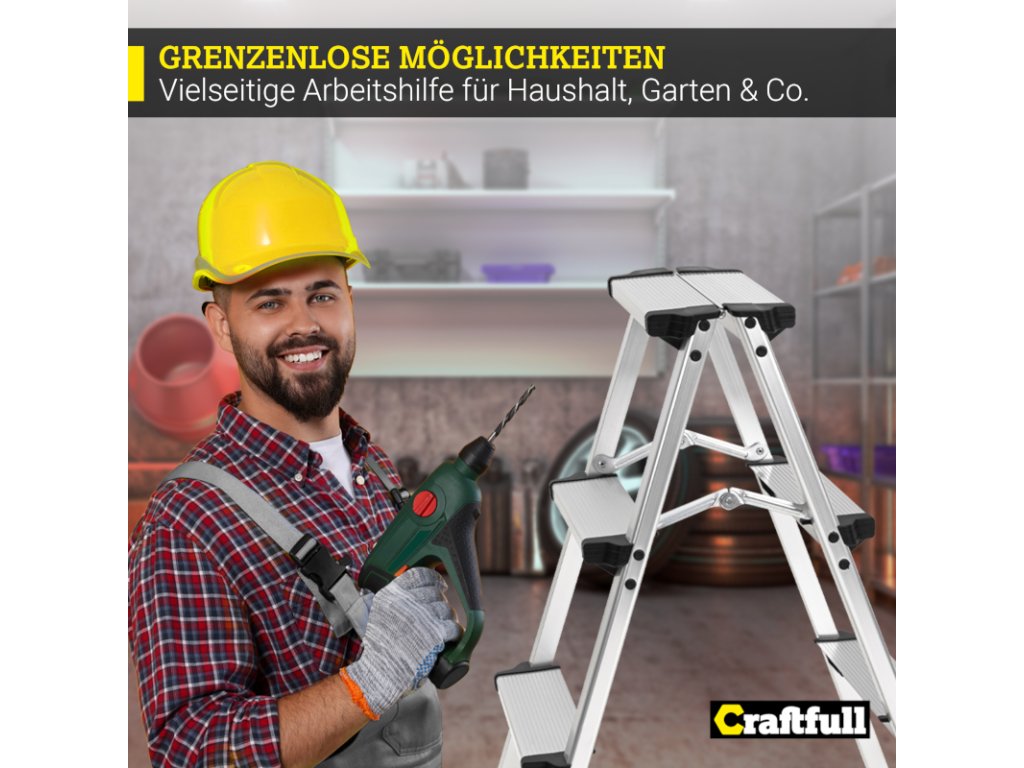 Pretože niekedy musíte vo výške manipulovať s ťažkým vybavením, je rebrík Craftfull CF-131A obzvlášť robustný vďaka vysokokvalitnému hliníku.
