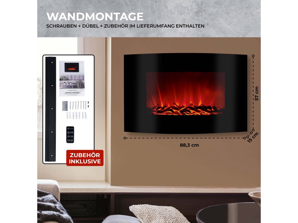 S elektrickým krbom Heidenfeld HF-WK100 získate všetky skrutky, hmoždinky a montážne konzoly na rýchle a jednoduché upevnenie zariadenia na stenu. Potrebná je len malá bezpečná vzdialenosť od iných predmetov, ako je nábytok a závesy. Z tohto dôvodu môžete nástenný krb flexibilne umiestniť do miestnosti a optimálne ho začleniť do dizajnu vášho bývania.