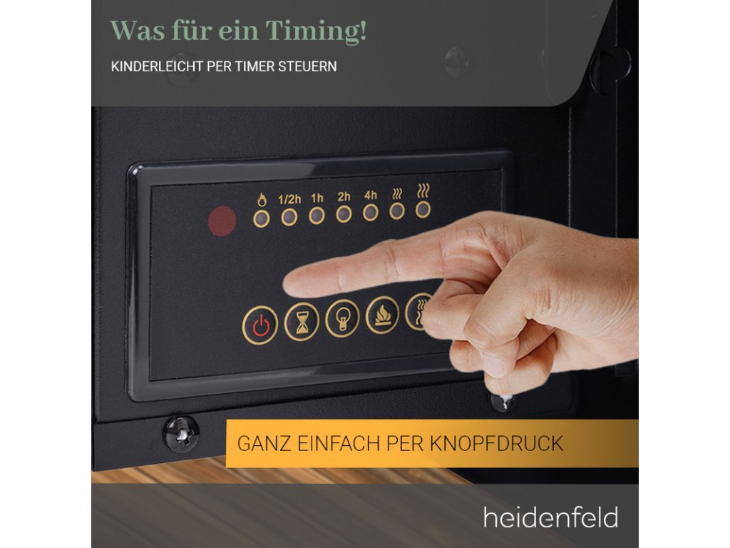 Ako dlho chcete, aby vaše plamene horeli? Len pol hodiny alebo celý večer? Môžete ho jednoducho ovládať stlačením tlačidla! Elektrický krb Heidenfeld HF-WK300 je na to vybavený praktickým časovačom . Nastavte požadované trvanie v 0,5-hodinových prírastkoch až do 7,5 hodiny . Elektrický krb sa po tomto naprogramovanom čase automaticky vypne.