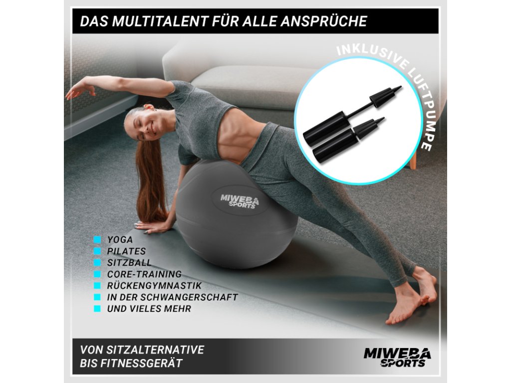 Lopta na cvičenie Miweba Sports GB100 urobí pre vaše telo viac ako len dobro. Nevedome si tým posilníte chrbticu a hlbšie uložené svaly . Dá sa však integrovať aj do širokej škály cvičení v oblasti jogy alebo pilatesu. Uľahčuje napríklad sedenie počas tehotenstva alebo v stresujúcom každodennom kancelárskom živote. Lopta na cvičenie je všestranným pomocníkom - pre dospelých, tínedžerov aj deti.