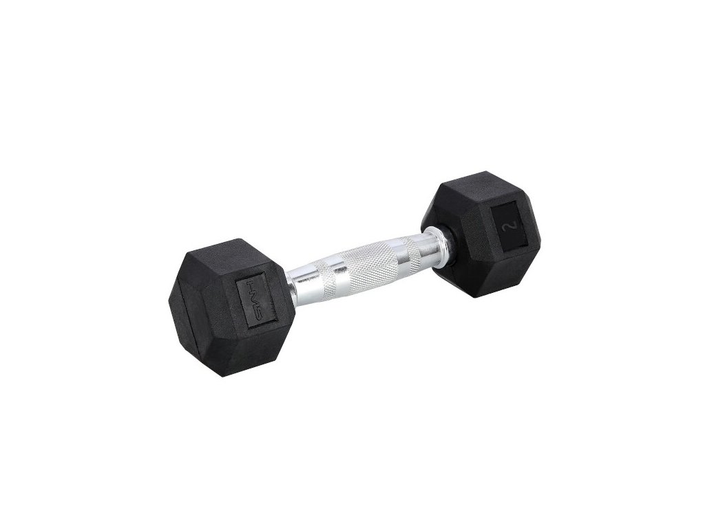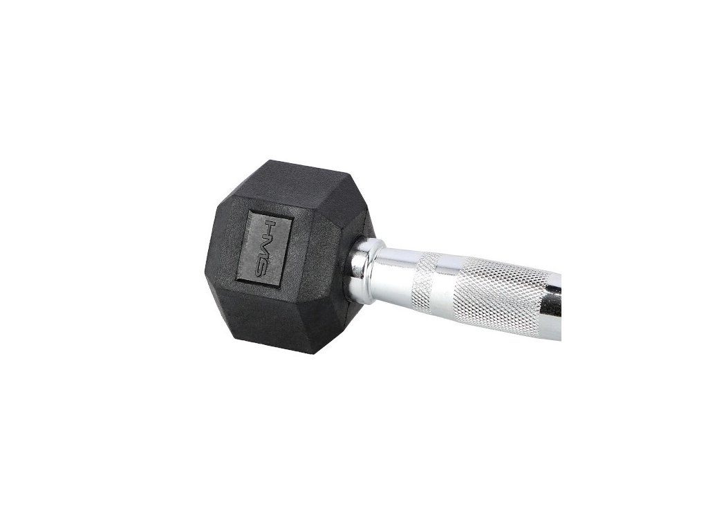 Šesťhranný tvar zamedzuje nechcenému pohybu činky pri jej uložení a pogumovanie predlžuje jej životnosť. Chrómový úchop je opatrený rádlovaním pre istejšie držanie.