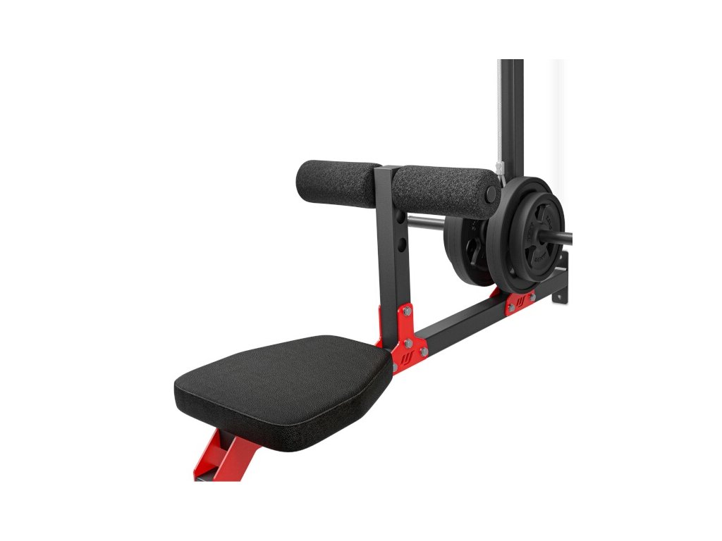 Robustné oceľové nášľapy sa používajú na zafixovanie počas tréningu so spodnou kladkou a tiež zabraňujú zdvíhaniu konštrukcie. Opierka na nohy je nastaviteľná do 3 úrovní a je vybavená valčekmi z peny EVA pre maximálne pohodlie. Pohodlné polstrovanie je vyrobené zo syntetickej kože.