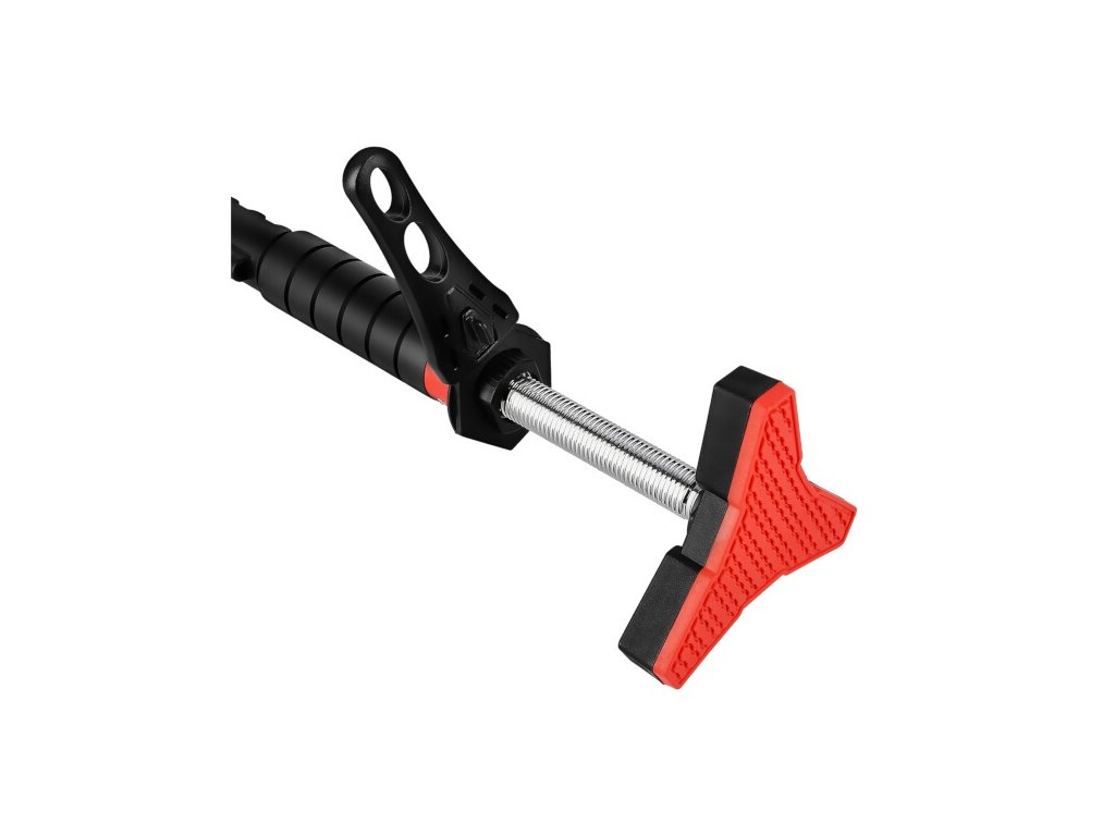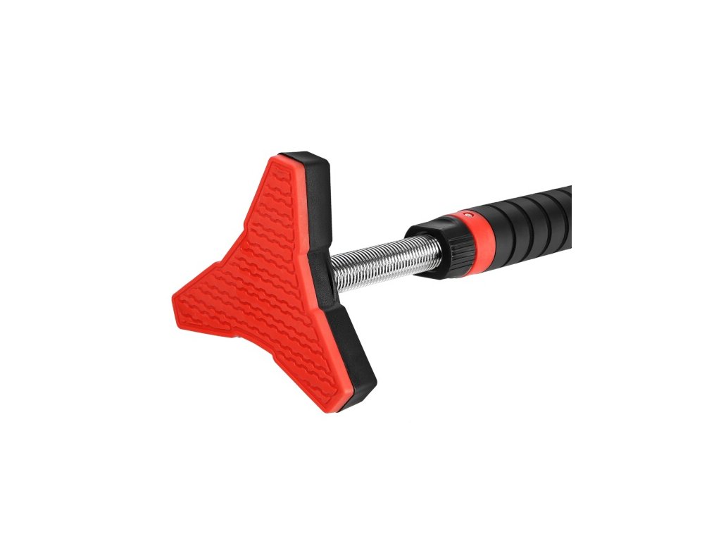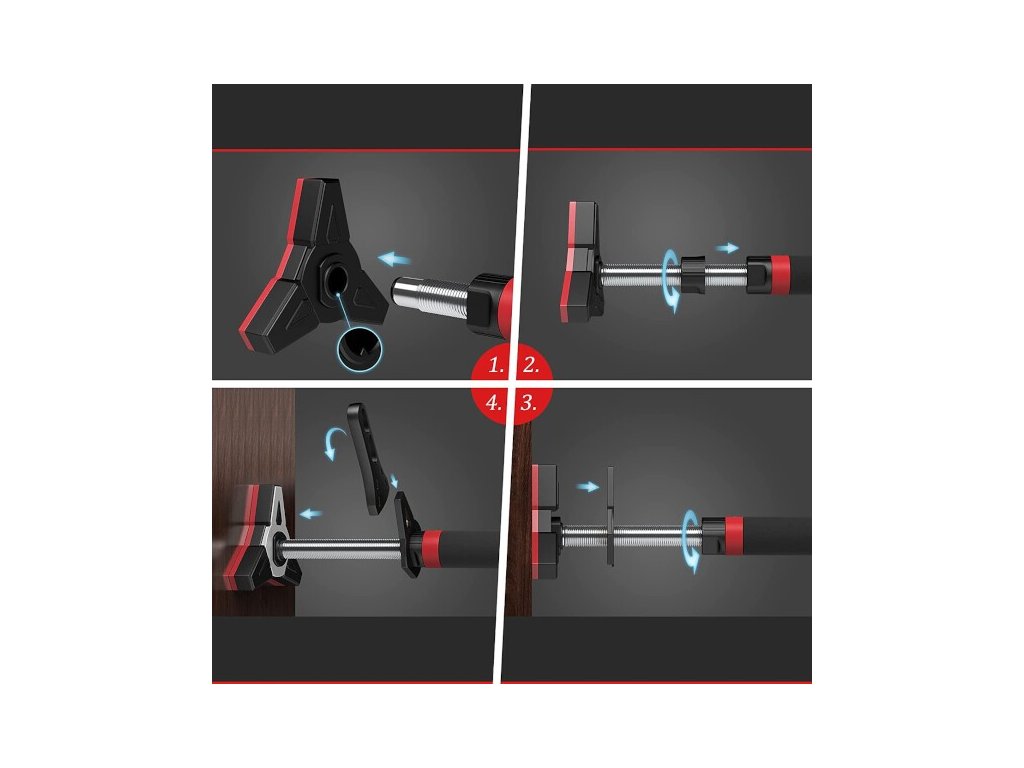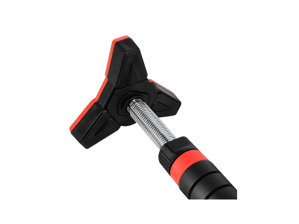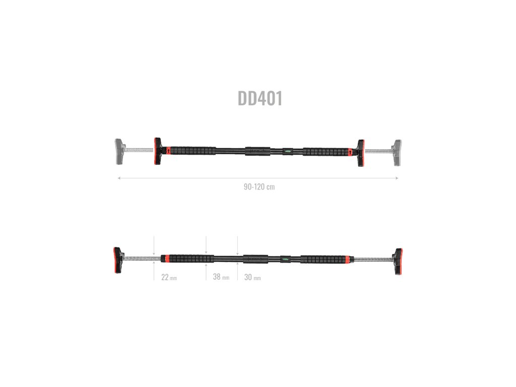 Po vybratí hrazdy z obalu sa na konce hrazdy nasadia koncové krytky. Rozložte hrazdu na podlahu tak, aby bola o niekoľko centimetrov kratšia ako šírka rámu dverí, a utiahnite čierne matice, aby ste zabezpečili dĺžku hrazdy. Vložte hrazdu DD401 do rámu dverí, vyrovnajte ju pomocou dodanej vodováhy a utiahnite čierne matice. Keď hrazda drží, vyberieme kľúč z koncových častí a predĺžime ho pomocou nadstavca, potom utiahneme čierne matice, aby hrazda pevne držala. Predĺženie kľúča a vodováhu si ponecháme na ďalšie použitie, kľúče umiestníme späť do koncových krytov a začneme trénovať.