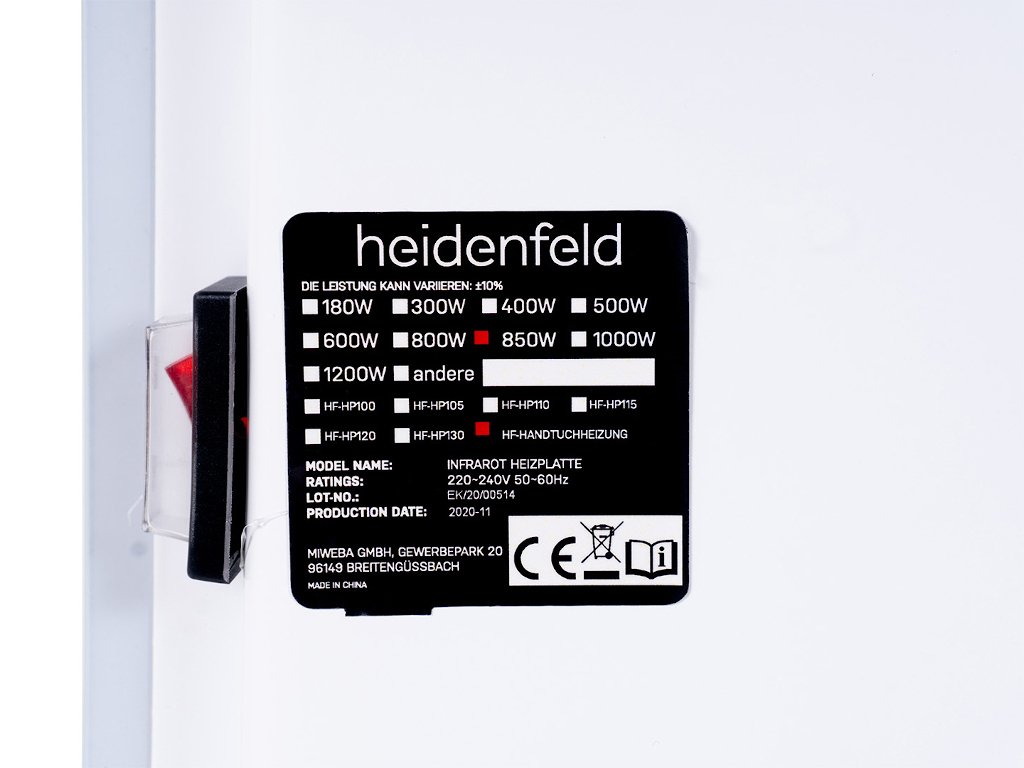 Infražiarič Heidenfeld na stenu je uterákový radiátor, ktorý spĺňa vysoké požiadavky na produkt a bezpečnosť. Pečať „Geprüfte Sicherheit“ (GS) potvrdzuje, že výrobok spĺňa všetky európske normy pre výrobky. Certifikát od Bureau Veritas (BV) navyše dokumentuje dodržiavanie bezpečnostných pravidiel pre infražiarič, ktorý je okrem iného vybavený ochranou proti prehriatiu a detskou poistkou .