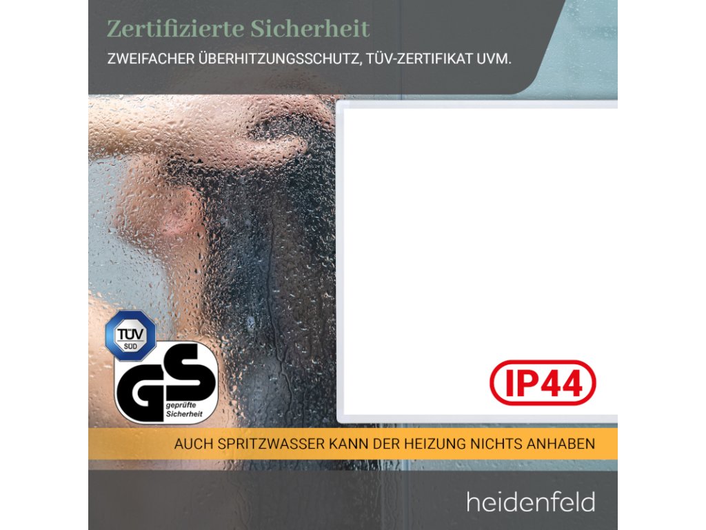 Najdôležitejšie je, že náš domov je miesto bezpečia. Preto je infražiarič Heidenfeld HF-HP100-2 vybavený dvojitou ochranou proti prehriatiu. Skúšobné certifikáty TÜV a GS potvrdzujú bezpečnostné aspekty.