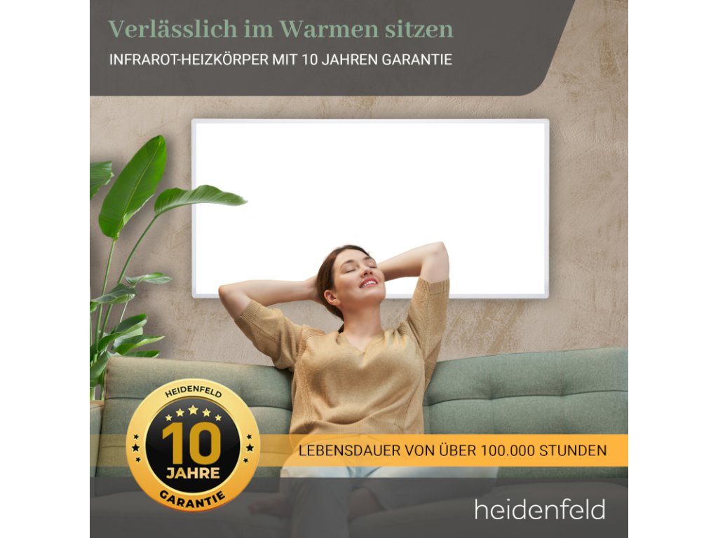 S infračerveným ohrievačom Heidenfeld HF-HP100-2 robíte dlhodobú investíciu do teplej budúcnosti. Pretože zaujme nielen životnosťou viac ako 100 000 hodín . Dlhú životnosť sľubuje aj 10 -ročná záruka . Dôverujte budúcemu a odolnému celkovému balíku s infračerveným ohrievačom Heidenfeld!