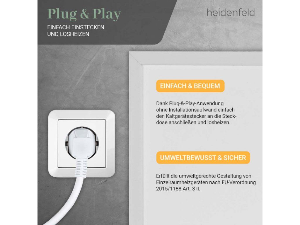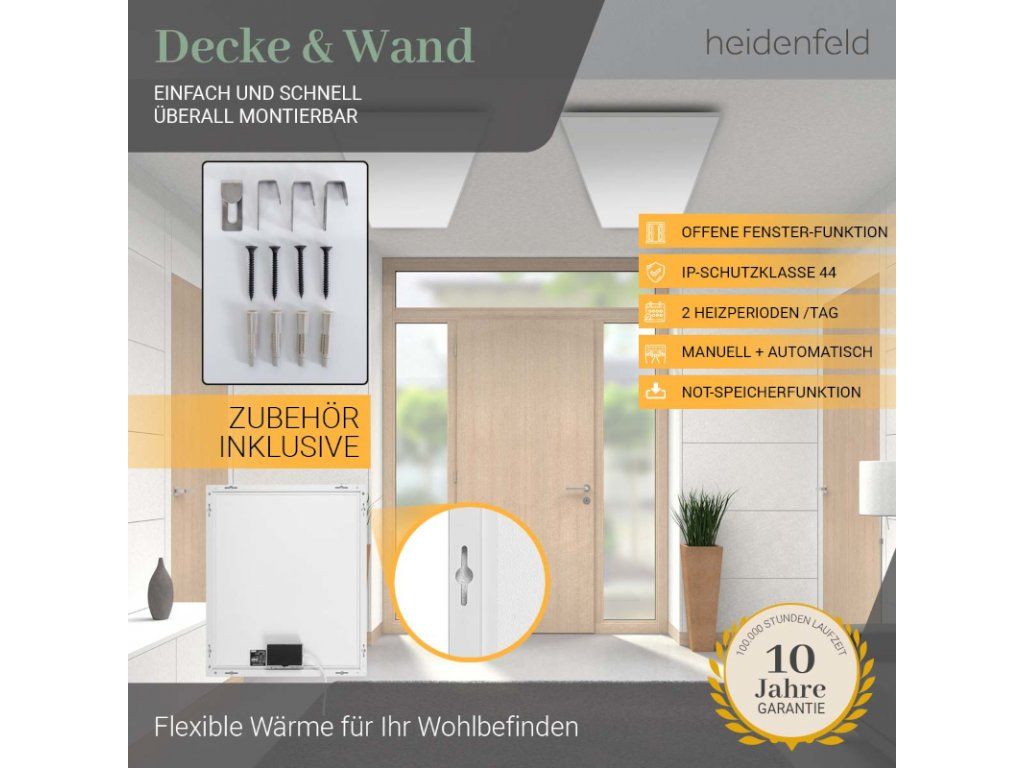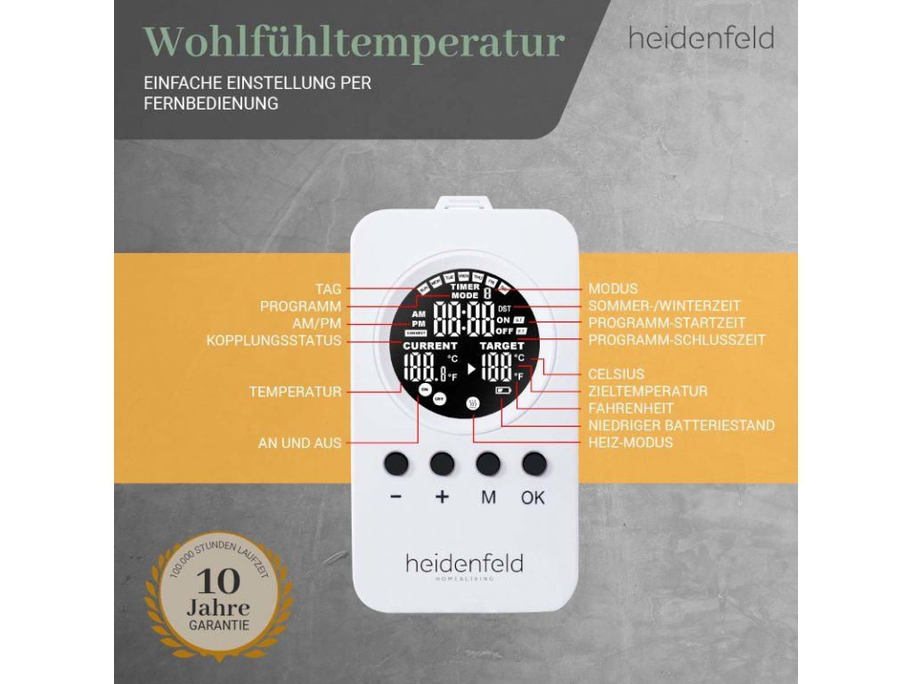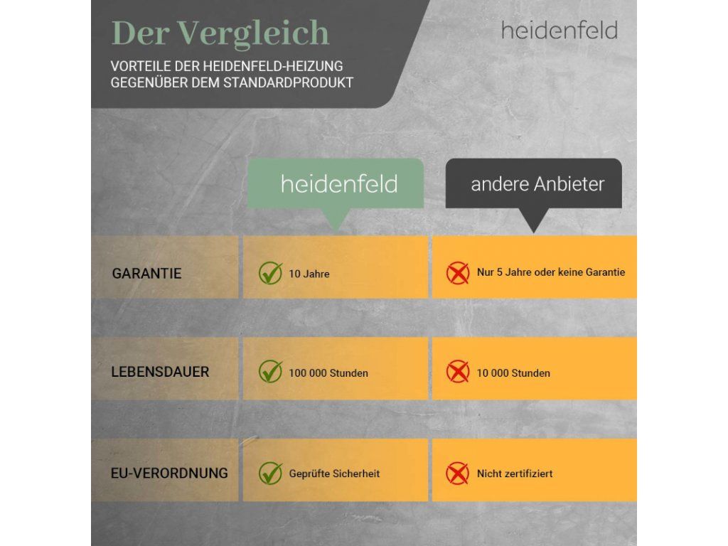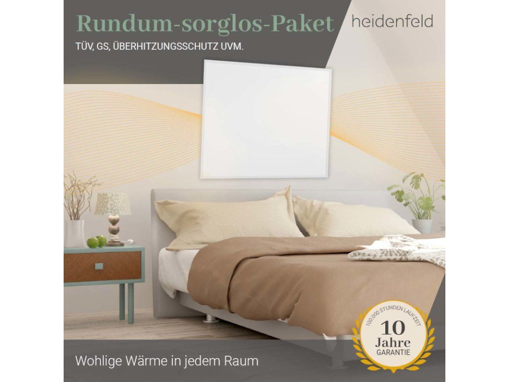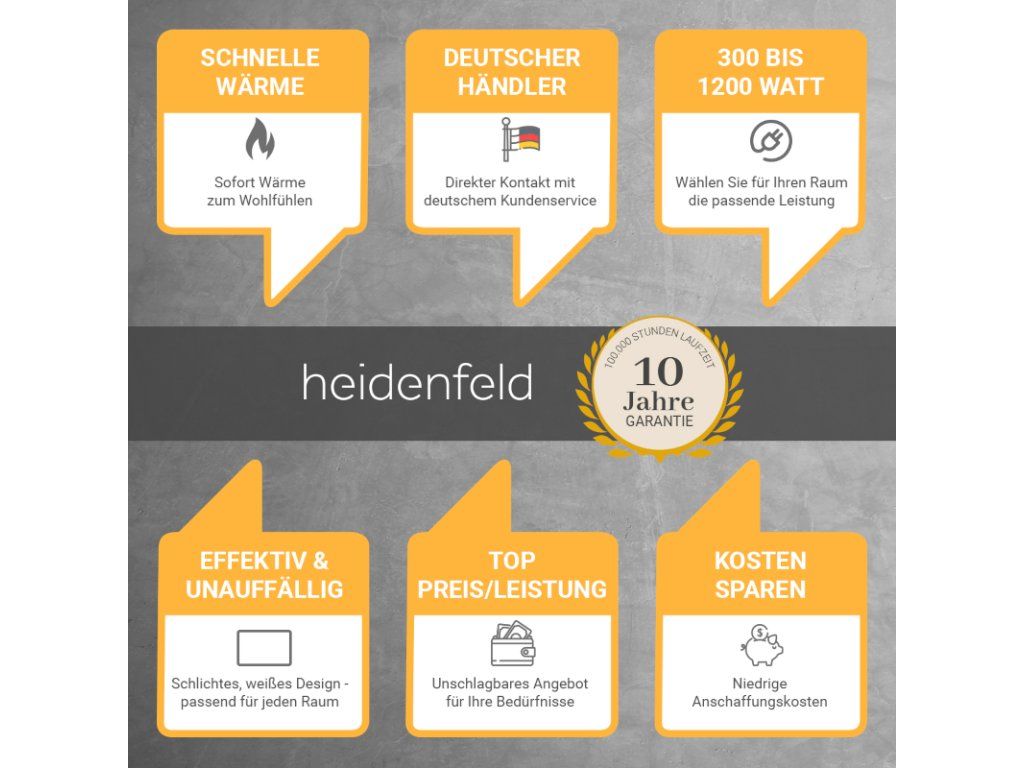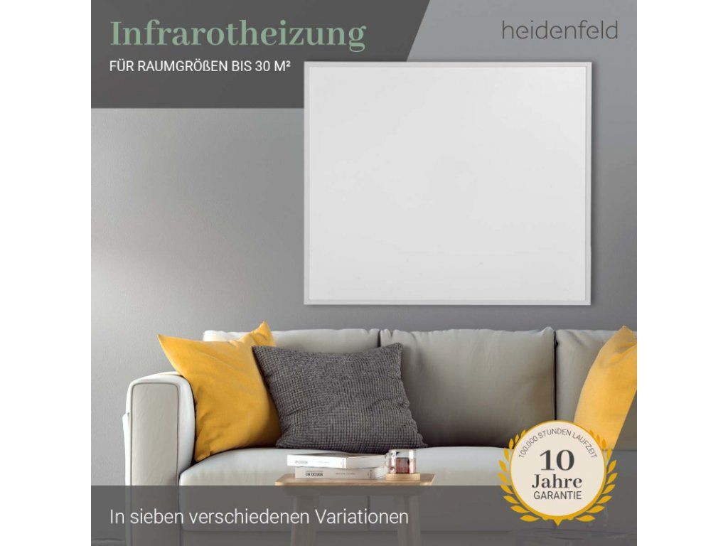 S týmto vysokokvalitným ohrevom vĺn horúčav si môžete urobiť pohodlie aj v budúcnosti! Pretože dlhá životnosť viac ako 100 000 hodín charakterizuje tento ohrievač s infračerveným žiarením. Sme presvedčení o kvalite. Preto vám na náš infračervený ohrievač Heidenfeld HF-HP106-3 poskytujeme 10-ročnú záruku , ktorá presahuje zákonnú záruku .