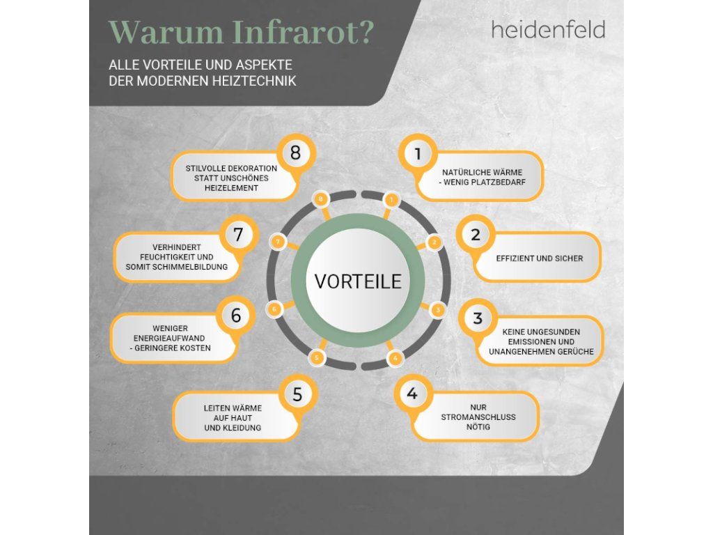 Ale prečo infračervené na vykurovanie? Súčasťou slnečných lúčov je aj infračervené žiarenie. Teplo generované infračerveným vykurovacím telesom je preto veľmi prirodzené. Teplo sa rovnomerne rozdeľuje na povrchy: To znamená, že vnímate teplotu ako mimoriadne príjemnú .