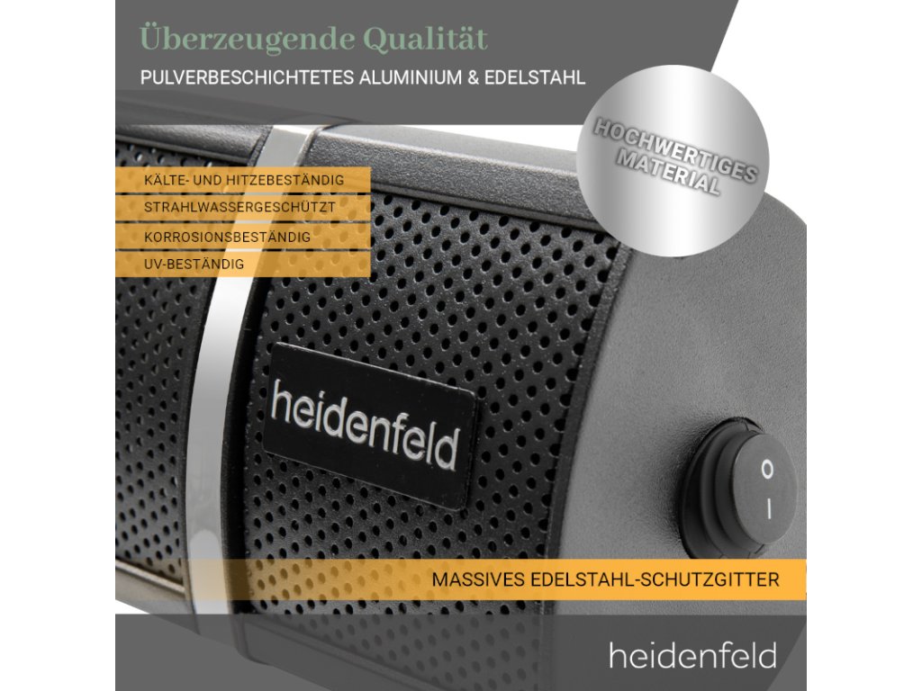 Nechcete svoj infračervený ohrievač používať iba v interiéri? Žiaden problém! Kryt z hliníka s práškovým nástrekom a ochranná mriežka z nehrdzavejúcej ocele robia infračervený ohrievač Heidenfeld IH110 2.0 odolný voči poveternostným vplyvom.