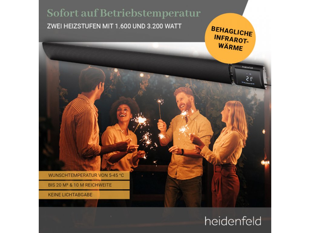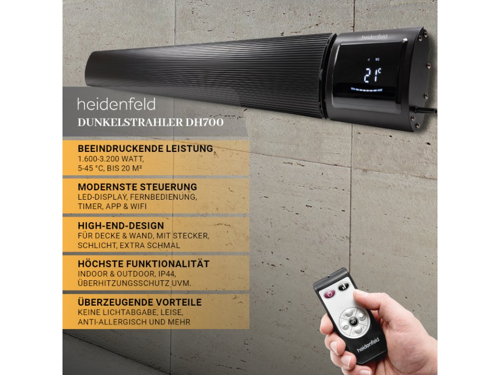 Pomocou časovača môžete naprogramovať, ako dlho má tmavý radiátor Heidenfeld Inferno DH700 fungovať. Maximálna doba prevádzky je 24 hodín. Na konci sa infračervený žiarič automaticky vypne. A čo je najlepšie: môžete ho ovládať pohodlne cez aplikáciu alebo pomocou diaľkového ovládača .